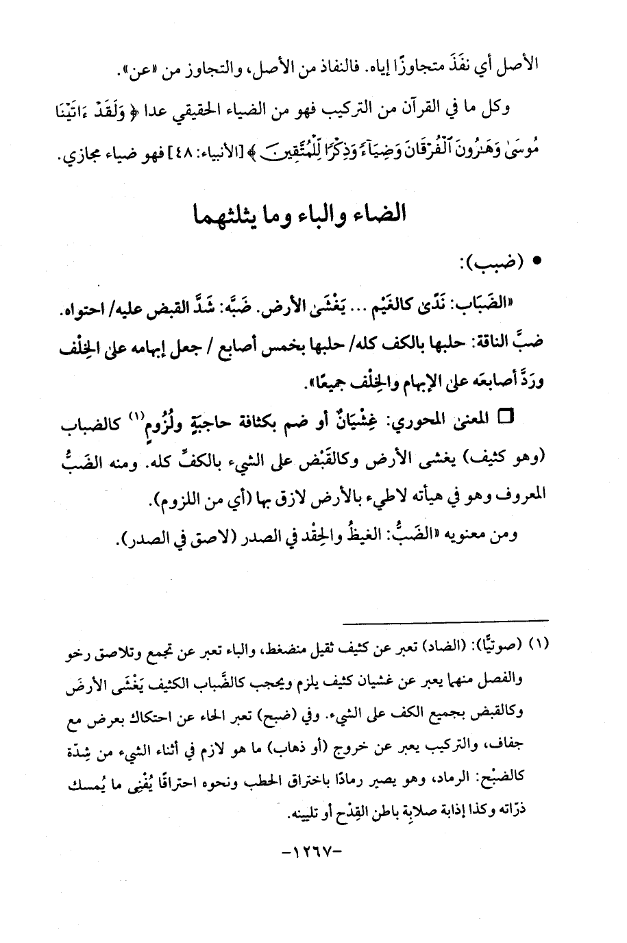 (¬1) (صوتيًّا): (الضاد) تعبر عن كثيف ثقيل منضغط، والباء تعبر عن تجمع وتلاصق رخو والفصل منهما يعبر عن عشيان كثيف يلزم ويحجب كالضَّباب الكثيف يَغْشَى الأرضَ وكالقبض بجميع الكف على الشيء. وفي (ضبح) تعبر الحاء عن احتكاك بعرض مع جفاف، والتركيب يعبر عن خروج (أو ذهاب) ما هو لازم في أثناء الشيء من شِدّة كالضبْح: الرماد، وهو يصير رمادًا باختراق الحطب ونحوه احترافًا يُفْنِي ما يُمسك ذرّاته وكذا إذابة صلابِة باطن القِدْح أو تليينة.