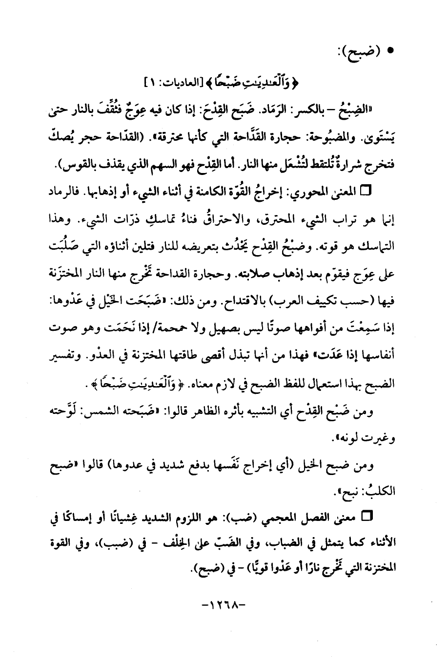 Qإخراجُ القُوّة الكامنة في أثناء الشيء أو إذهابها. فالرماد إنما هو تراب الشيء المحترق، والاحتراقُ فناءُ تماسكِ ذرّات الشيء. وهذا التماسك هو قوته. وضبْحُ القِدْح يَحْدُث تعريضه للنار فتلين أثناؤه التي صَلُبَت على عِوَج فيقوّم بعد إذهاب صلابته. وحجارة القداحة تَخْرج منها النار المختزَنة فيها (حسب تكييف العرب) بالاقتداح. ومن ذلك: "ضَبَحَت الخَيْل في عَدْوها: إذا سَمِعْتَ من أفواهها صوتًا ليس بصهيل ولا حمحمة/ إذا نَحَمَت وهو صوت أنفاسها إذا عَدَت "فهذا من أنها تبذل أقصى طاقتها المختزنة في العدْو. وتفسير الضبح بهذا استعمال للفظ الضبح في لازم معناه. {وَالْعَادِيَاتِ ضَبْحًا}.