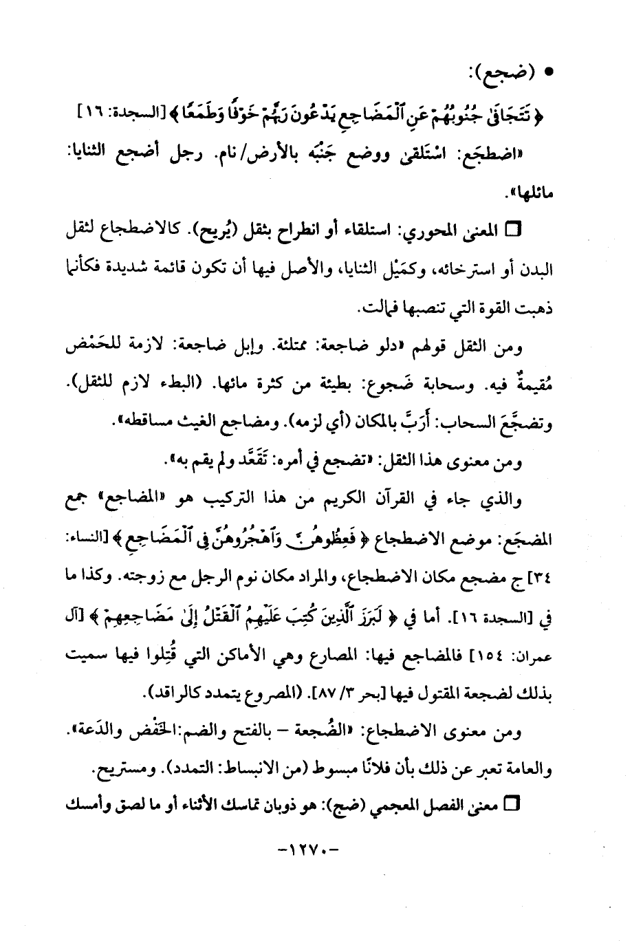 والذي جاء في القرآن الكريم من هذا التركيب هو "المضاجع "جمع المضجَع: موضع الاضطجاع {فَعِظُوهُنَّ وَاهْجُرُوهُنَّ فِي الْمَضَاجِعِ} [النساء: 34] ج مضجع مكان الاضطجاع، والمراد مكان نوم الرجل مع زوجته. وكذا ما في [السجدة: 16]. أما في {لَبَرَزَ الَّذِينَ كُتِبَ عَلَيْهِمُ الْقَتْلُ إِلَى مَضَاجِعِهِمْ} [آل عمران: 154] فالمضاجع فيها: المصارع وهي الأماكن التي قُتِلوا فيها سميت بذلك لضجعة المقتول فيها [بحر 3/ 87]. (المصروع يتمدد كالراقد).