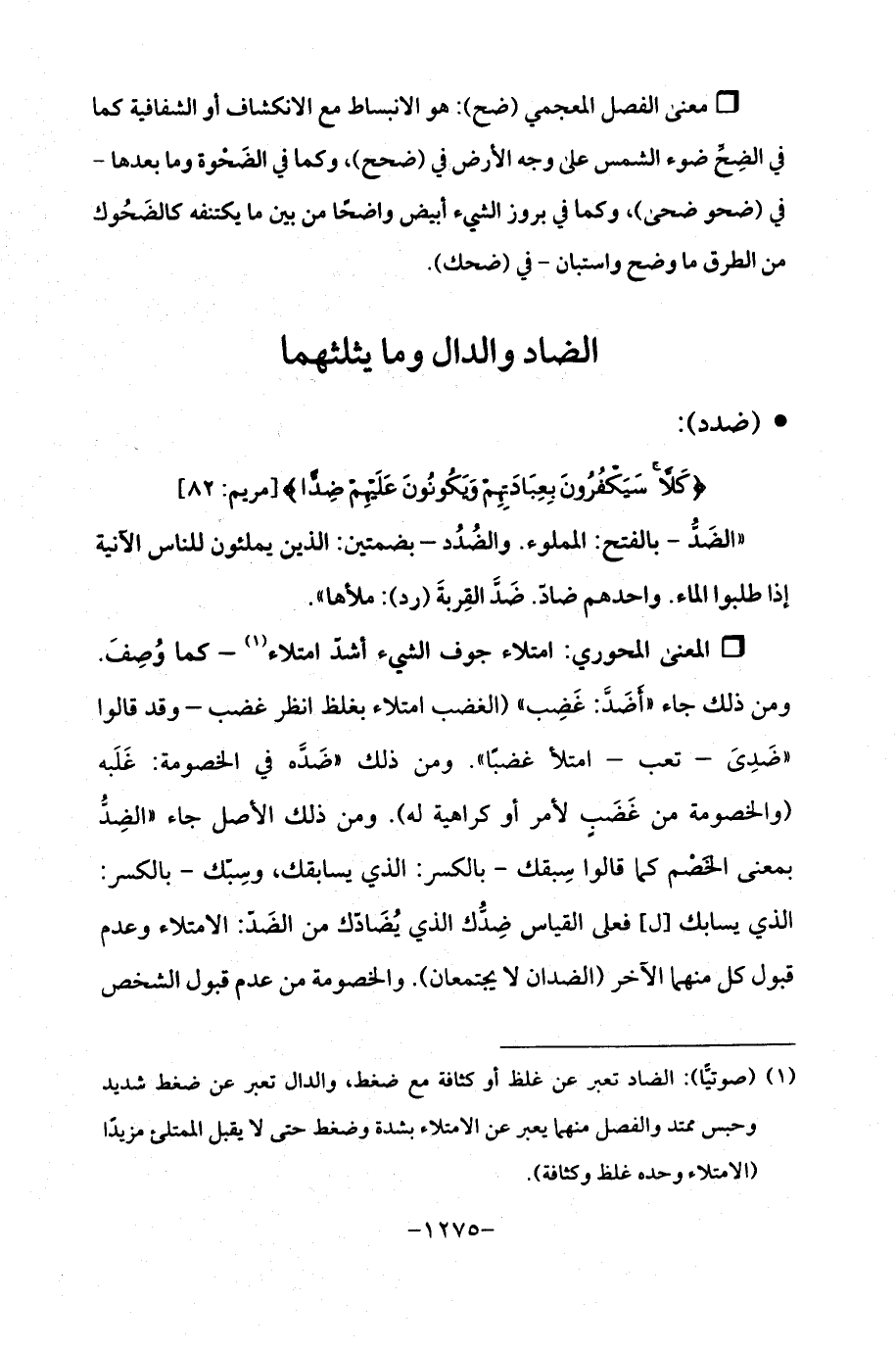 (¬1) (صوتيًّا): الضاد تعبر عن غلظ أو كثافة مع ضغط، والدال تعبر عن ضغط شديد وحبس ممتد والفصل منهما يعبر عن الامتلاء بشدة وضغط حتى لا يقبل الممتلئ مزيدًا (الامتلاء وحده غلظ وكثافة).
