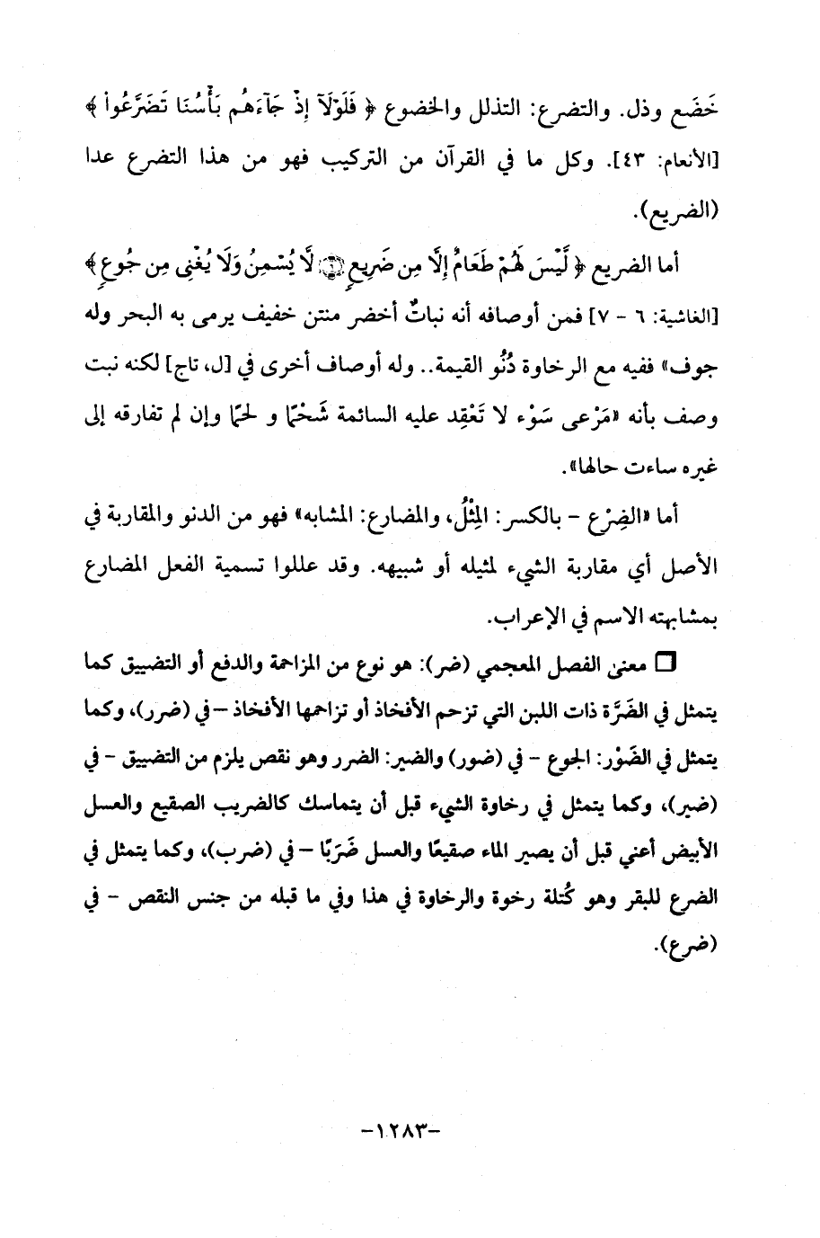 ° معنى الفصل المعجمي (ضر): هو نوع من المزاحمة والدفع أو التضيق كما يتمثل في الضَرَّة ذات اللبن التي تزحم الأفخاذ أو تزاحمها الأفخاذ -في (ضرر)، وكما يتمثل في الضَوْر: الجوع -في (ضور) والضير: الضرر وهو نقص يلزم من التضييق -في (ضير)، وكما يتمثل في رخاوة الشيء قبل أن يتماسك كالضريب الصقيع والعسل الأبيض أعني قل أن يصير الماء صقيعًا والعسل ضَرَبًا -في (ضرب)، وكما يتمثل في الضرع للبقر وهو كُتلة رخوة والرخاوة في هذا وفي ما قبله من جنس النقص -في (ضرع).