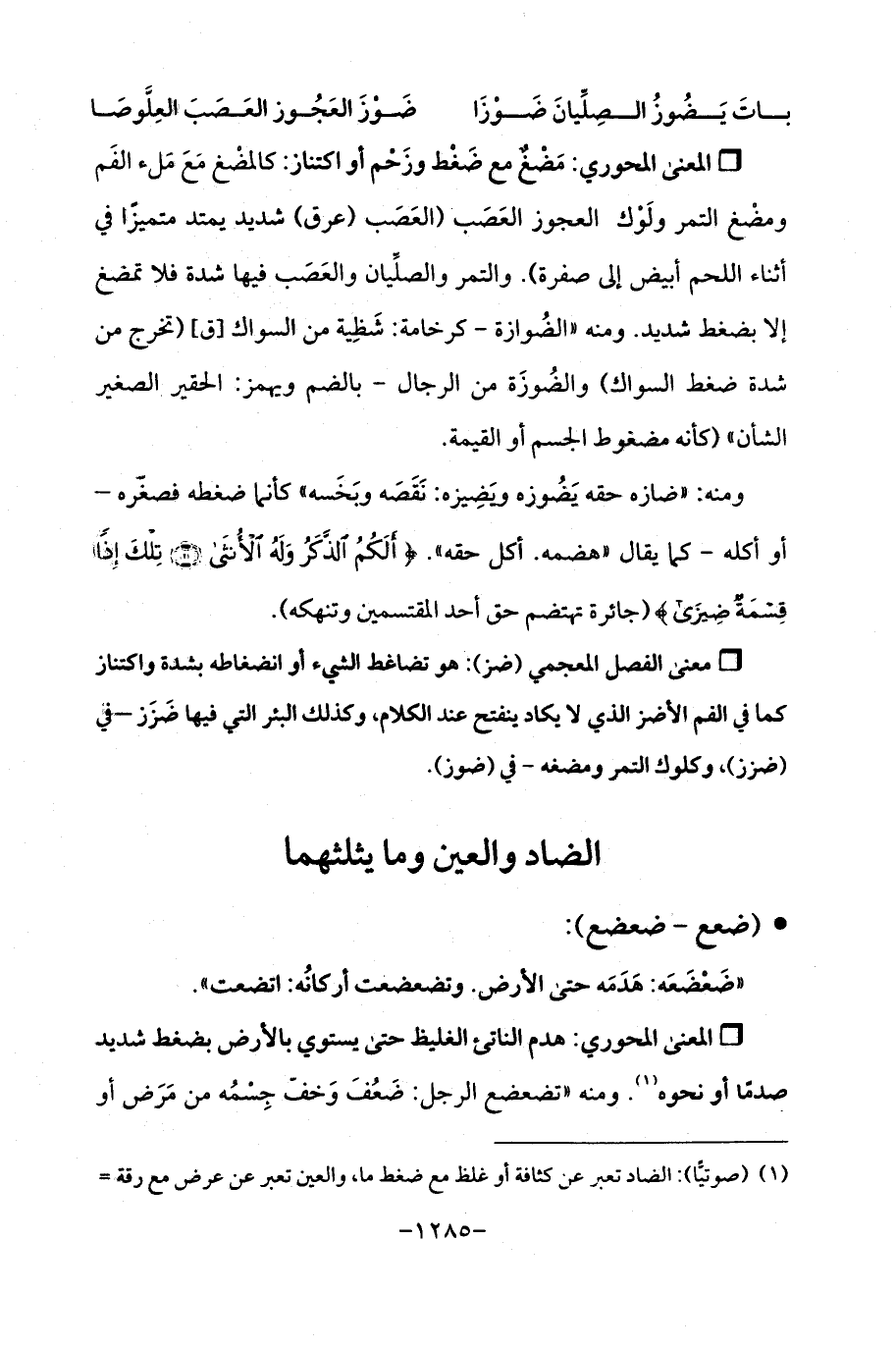° معنى الفصل المعجمي (ضز): هو تضاغط الشيء أو انضغاطه بشدة واكتناز كما في الفم الأضز الذك لا يكاد ينفتح عند الكلام، وكذلك البئر التي فيها ضَزَز -في (ضزز)، وكلوك التمر ومضغه -في (ضوز).