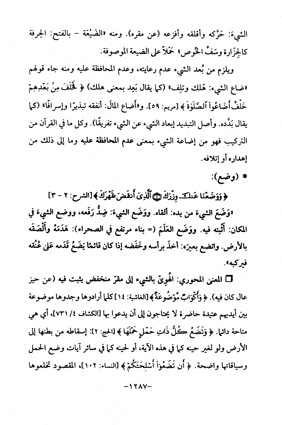 Qالهُوِيّ بالشيء إلى مقرّ منخفض يثبت فيه (عن حيز عال كان فيه). {وَأَكْوَابٍ مَوْضُوعَةٌ} [الغاشية: 14] كلما أرادوها وجدوها موضوعة بين أيديهم عتيدة حاضرة لا يحْتاجون إلى أن يدعوا بها [الكشاف 4/ 731]، أي هي متاحة دائما. {وَتَضعُ كُلُّ ذَاتِ حَمْلٍ حَمْلَهَا} [الحج: 2]: إسقاطه من بطنها إلى الأرض ولو لغير حينه كما في هذه الآية، أو لحينه كما في سائر آيات وضع الحمل وسياقاتها واضحة. {أَنْ تَضَعُوا أَسْلِحَتَكُمْ} [النساء: 102]، المقصود تخلعوها