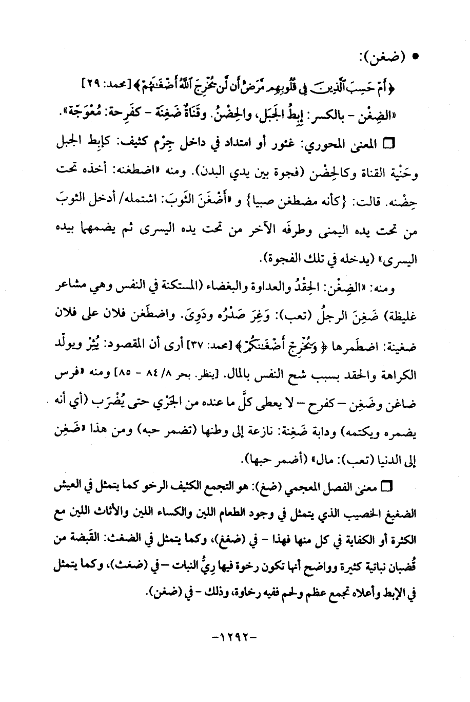ومنه: "الضِغْن: الحِقْدُ والعداوة والبغضاء (المستكنة في النفس وهي مشاعر غليظة) ضَغِنَ الرجلُ (تعب): وَغِرَ صَدْرُه ودَوِىَ. واضطَغن فلان على فلان ضغينة: اضطَمرها {وَيُخْرِجْ أَضْغَانَكُمْ} [محمد: 37] أرى أن المقصود: يُثِرْ ويولّد الكراهة والحقد بسبب شح النفس بالمال. [ينظر. بحر 8/ 84 - 85] ومنه "فرس ضاغن وضَغِن -كفرح- لا يعطى كلَّ ما عنده من الجَرْي حتَّى يُضْرَب (أي أنَّه يضمره ويكتمه) ودابة ضَغِنة: نازعة إلى وطنها (تضمر حبه) ومن هذا "ضَغِن إلى الدنيا (تعب): مال " (أضمر حبها).
