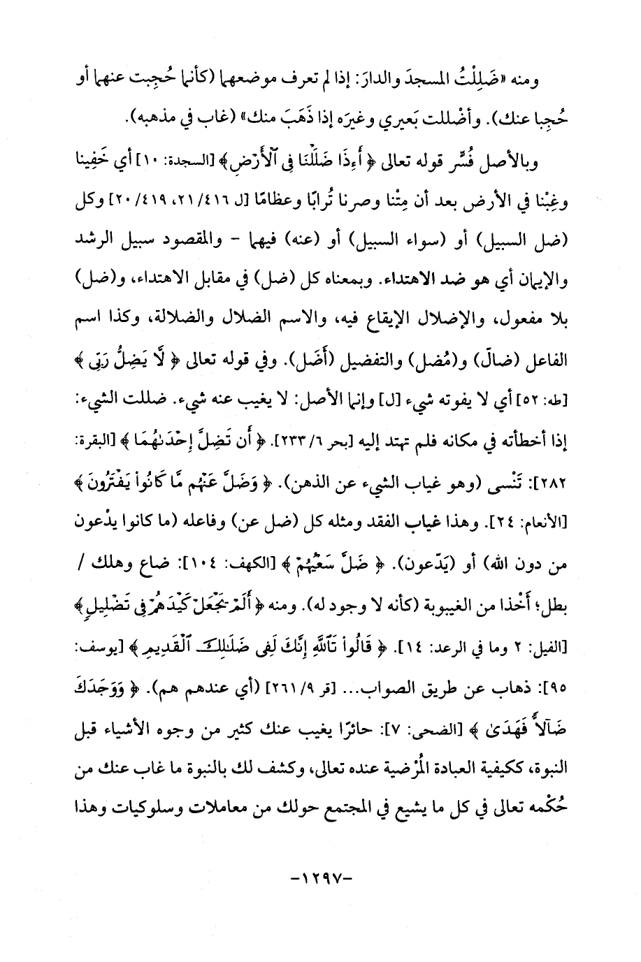 وبالأصل فُسِّر قوله تعالى {أَإِذَا ضَلَلْنَا فِي الْأَرْضِ} [السجدة: 10] أي خَفِينا وغِبْنا في الأرض بعد أن مِتْنا وصرنا تُرابًا وعظامًا [ل 416/ 21، 419/ 20] وكل (ضل السبيل) أو (سواء السبيل) أو (عنه) فيهما -والمقصود سبيل الرشد والإيمان أي هو ضد الاهتداء. وبمعناه كل (ضل) في مقابل الاهتداء، و (ضل) بلا مفعول، والإضلال الإيقاع فيه، والاسم الضلال والضلالة، وكذا اسم الفاعل (ضالّ) و (مُضل) والتفضيل (أَضَل). وفي قوله تعالى {لَا يَضِلُّ رَبِّي} [طه: 52] أي لا يفوته شيء [ل] وإنما الأصل: لا يغيب عنه شيء. ضللت الشيء: إذا أخطأته في مكانه فلم تهتد إليه [بحر 6/ 233]. {أَنْ تَضِلَّ إِحْدَاهُمَا} [البقرة: 282]: تَنْسى (وهو غياب الشيء عن الذهن). {وَضَلَّ عَنْهُمْ مَا كَانُوا يَفْتَرُونَ} [الأنعام: 24]. وهذا غياب الفقد ومثله كل (ضل عن) وفاعله (ما كانوا يدْعون من دون اللَّه) أو (يَدّعون). {ضَلَّ سَعْيُهُمْ} [الكهف: 104]: ضاع وهلك/ بطل؛ أَخْذا من الغيبوبة (كأنه لا وجود له). ومنه {أَلَمْ يَجْعَلْ كَيْدَهُمْ فِي تَضْلِيلٍ} [الفيل: 2 وما في الرعد: 14]. {قَالُوا تَاللَّهِ إِنَّكَ لَفِي ضَلَالِكَ الْقَدِيمِ} [يوسف: 95]: ذهاب عن طريق الصواب. . . [قر 9/ 261] (أي عندهم هم). {وَوَجَدَكَ ضَالًّا فَهَدَى} [الضحى: 7]: حائرًا يغيب عنك كثير من وجوه الأشياء قبل النبوة، ككيفية العبادة المُرْضية عنده تعالى، وكشف لك بالنبوة ما غاب عنك من حُكْمه تعالى في كل ما يشيع في المجتمع حولك من معاملات وسلوكيات وهذا