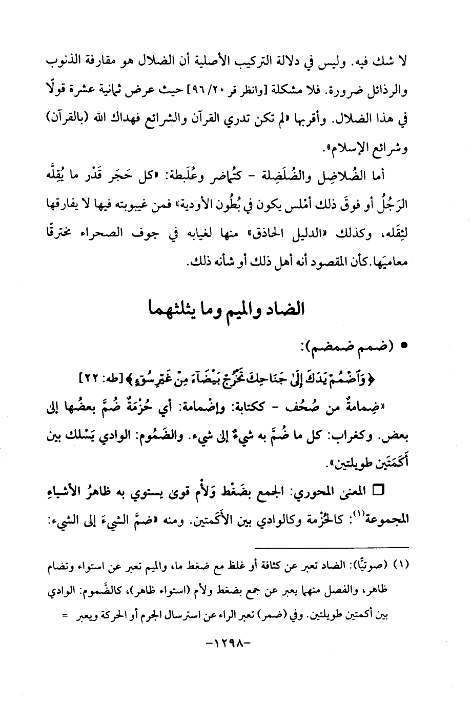 (¬1) (صوتيًّا): الضاد تعبر عن كثافة أو غلظ مع ضغط ما، والميم تعبر عن استواء وتضام ظاهر، والفصل منهما يعبر عن جمع بضغط ولأم (استواء ظاهر)، كالضَّموم: الوادي بين أكمتين طويلتين. وفي (ضمر) تعبر الراء عن استرسال الجرم أو الحركة ويعبر =