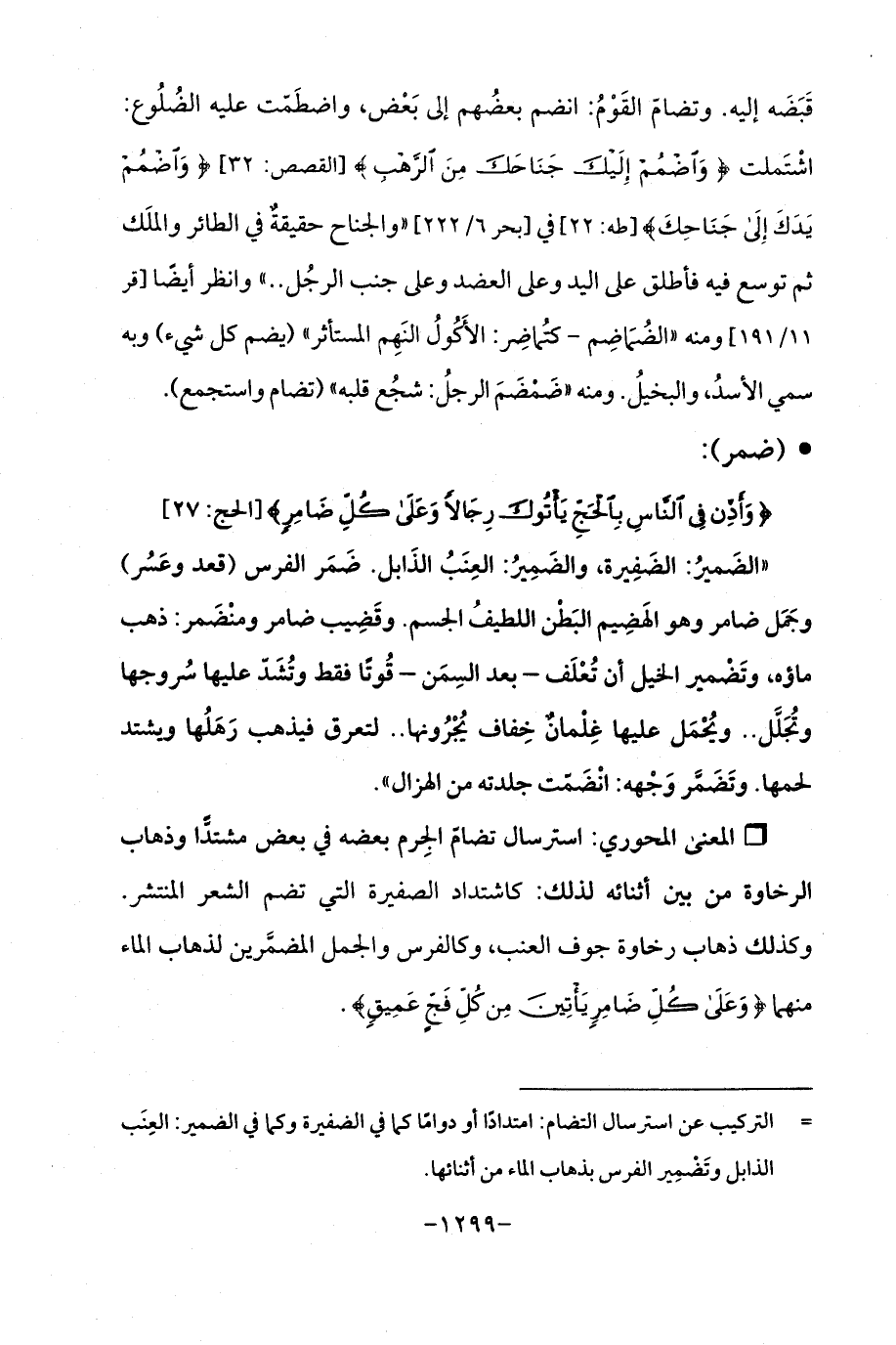 قَبَضَه إليه. وتضامّ القَوْمُ: انضم بعضُهم إلى بَعْض، واضطَمّت عليه الضُلُوع: شْتَملت {وَاضْمُمْ إِلَيْكَ جَنَاحَكَ مِنَ الرَّهْبِ} [القصص: 32] {وَاضْمُمْ إِلَيْكَ جَنَاحَكَ} [طه: 22] في [بحر 6/ 222] "والجناح حقيقةٌ في الطائر والملَك ثم توسع فيه فأطلق على اليد وعلى العضد وعلى جنب الرجُل. . "وانظر أيضًا [قر 11/ 191] ومنه "الضُمَاضم - كتُماضِر: الأَكُولُ النَهِم المستأثر " (يضم كل شيء) وبه سمي الأسدُ، والبخيلُ. ومنه "ضَمْضَمَ الرجلُ: شجُع قلبه " (تضام واستجمع).