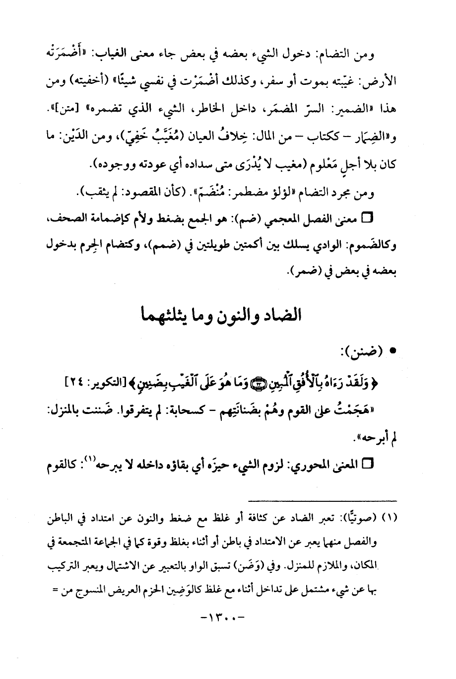 (¬1) (صوتيًّا): تعبر الضاد عن كثافة أو غلظ مع ضغط والنون عن امتداد في الباطن والفصل منهما يعبر عن الامتداد في باطن أو أثناء بغلظ وقوة كما في الجماعة المتجمعة في المكان، والملازم للمنزل. وفي (وَضَن) تسبق الواو بالتعبير عن الاشتمال ويعبر التركيب بها عن شيء مشتمل على تداخل أثناء مع غلظ كالوَضِين الحزم العريض المنسوج من =
