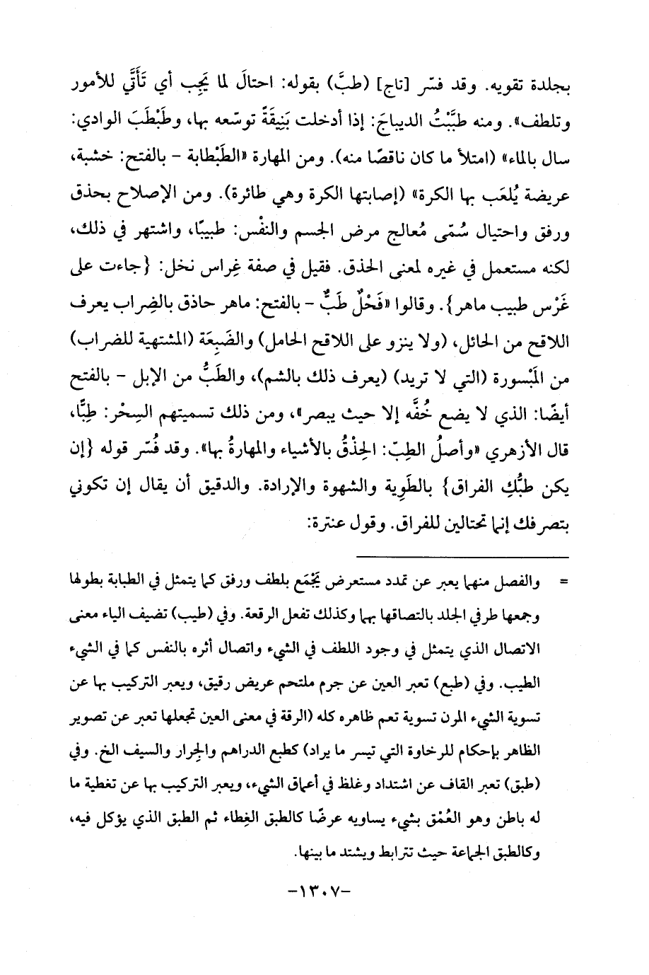 بجلدة تقويه. وقد فسّر [تاج] (طبَّ) بقوله: احتالَ لما يَجِب أي تَأَتَّي للأمور وتلطف ". ومنه طبَّبْتُ الديباجَ: إذا أدخلت بَنِيقَةً توسّعه بها، وطَبْطَبَ الوادي: سال بالماء " (امتلأ ما كان ناقصًا منه). ومن المهارة "الطَبْطابة -بالفتح: خشبة، عريضة يُلعَب بها الكرة " (إصابتها الكرة وهي طائرة). ومن الإصلاح بحذق ورفق واحتيال سُمّى مُعالج مرض الجسم والنفْس: طبيبًا، واشتهر في ذلك، لكنه مستعمل في غيره لمعنى الحذق. فقيل في صفة غِراس نخل: {جاءت على غَرْس طبيب ماهر}. وقالوا "فَحْلٌ طَبٌّ -بالفتح: ماهر حاذق بالضِراب يعرف اللاقح من الحائل، (ولا ينزو على اللاقح الحامل) والضَبِعَة (المشهية للضراب) من المَبْسورة (التي لا تريد) (يعرف ذلك بالشم)، والطَبُّ من الإبل -بالفتح أيضًا: الذي لا يضع خُفَّه إلا حيث يبصر "، ومن ذلك تسميتهم السِحْر: طِيًّا، قال الأزهري "وأصلُ الطِبّ: الحِذْقُ بالأشياء والمهارةُ بها ". وقد فُسّر قوله {إن يكن طبُّكِ الفراق} بالطَوِية والشهوة والإرادة. والدقيق أن يقال إن تكوني بتصرفك إنما تحتالين للفراق. وقول عنترة: