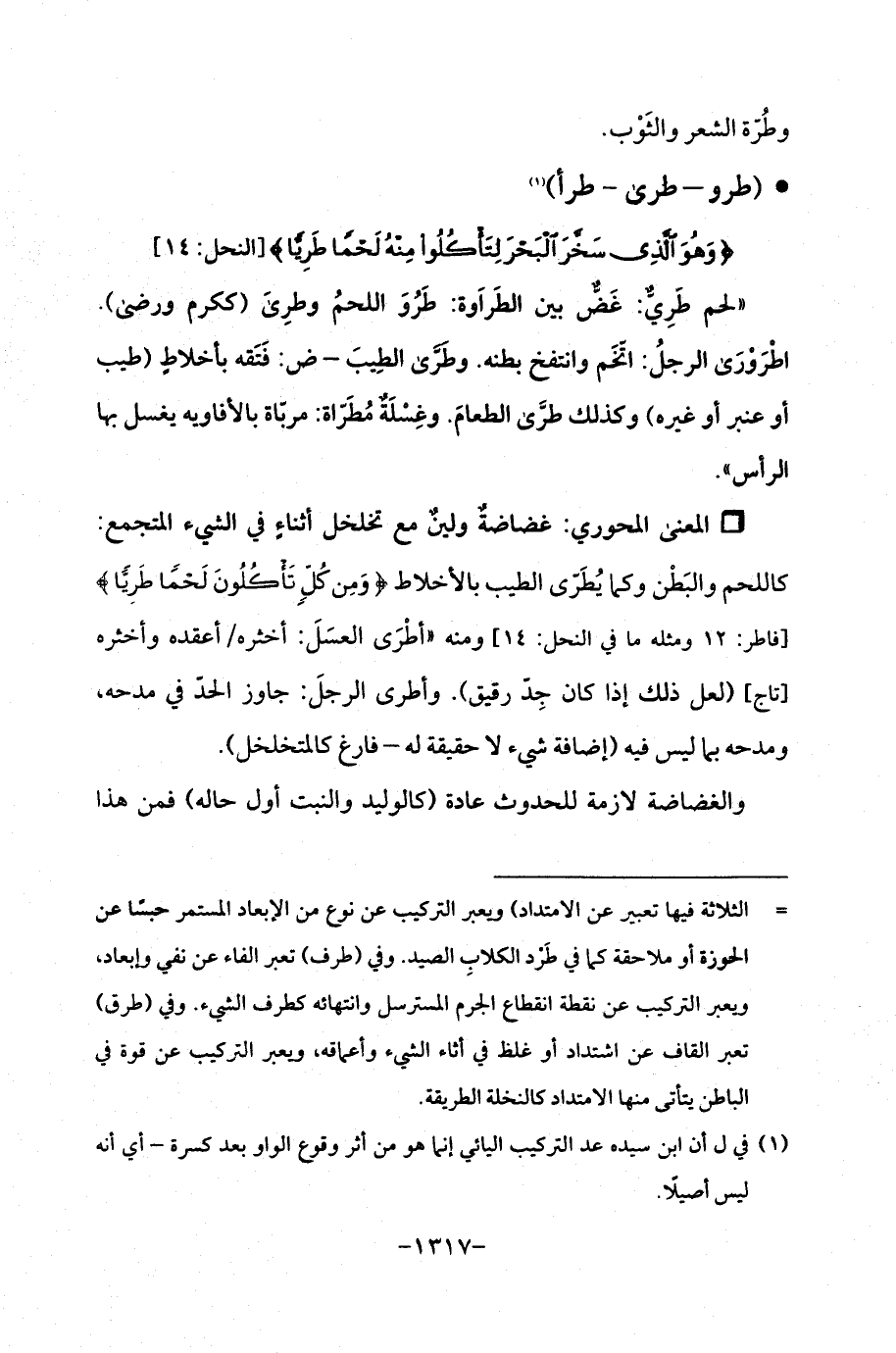 "لحم طَرِيٌّ: غَضٌّ بين الطَراوة: طَرُوَ اللحمُ وطرِى (ككرم ورضى). اطْرَوْرَى الرجلُ: اتّخَم وانتفخ بطنه. وطَرَّى الطِيبَ - ض: فتَقه بأخلاطٍ (طيب أو عنبر أو غيره) وكذلك طرَّى الطعامَ. وغِسْلَةٌ مُطَرّاة: مربّاة بالأفاويه يغسل بها الرأس ".