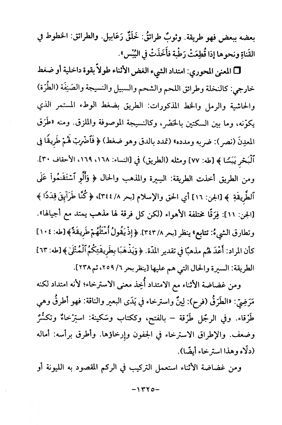 Qامتداد الشيء الغض الأثناء طولًا بقوة داخلية أو ضغط خارجي: كالنخلة وطرائق اللحم والشحم والسبيل والنسيجة والصَنِفَة (الطُرّة) والحاشية والرمل والخط المذكورات: الطريق بضغط الوطء المستمر الذي يكوّنه، وما بين السكتين بالحَصْر، وكالنسيجة الموصوفة والملزق. ومنه "طَرَق المعدِنَ (نصر): ضربه ومدده " (تمدد بالدق وهو ضغط) {فَاضْرِبْ لَهُمْ طَرِيقًا فِي الْبَحْرِ يَبَسًا} [طه: 77] ومثله (الطريق) في [النساء: 168، 169، الأحقاف 30]. ومن الطريق أخذت الطريقة: السِيرة والمذهب والحال {وَأَلَّوِ اسْتَقَامُوا عَلَى الطَّرِيقَةِ} [الجن: 16] أي الحق والإسلام [بحر 8/ 344]، {كُنَّا طَرَائِقَ قِدَدًا} [الجن: 11]: فِرَقًا مختلفة الأهواء (لكن كل فرقة لها مذهب يمتد مع أجيالها ". وتطارق الشيءُ؛ تتابع "ينظر [بحر 8/ 343]. {إِذْ يَقُولُ أَمْثَلُهُمْ طَرِيقَةً} [طه: 104] كأن المراد: أَعْدَ لهُم مذهبًا في تقدير المدّة. {وَيَذْهَبَا بِطَرِيقَتِكُمُ الْمُثْلَى} [طه: 63] الطريقة: السيرة والحال التي هم عليها [ينظر بحر 6/ 259، ثم 238].