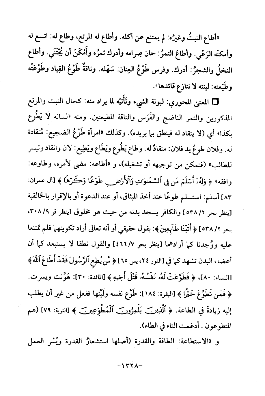 Qليونة الشيء وتَأَتيّه لما يراد منه: كحال النبت والمرتع المذكورين والتمر الناضج والفَرَس والناقة المطيعيتن. ومنه "لسانه لا يَطُوع بكذا "أى (لا ينقاد له فينطق بما يريده). وكذلك "امرأة طَوْعُ الضجيع: مُنقادة له. وفلان طوعُ يد فلان: منقادٌ له. وطاع يَطُوع ويَطَاع ويَطِيع: لان وانقاد وتيسر للطالب، (فتمكن من توجيهه أو تشغيله)، و "أطاعه: مضى لأمره، وطاوعه: وافقه " {وَلَهُ أَسْلَمَ مَنْ فِي السَّمَاوَاتِ وَالْأَرْضِ طَوْعًا وَكَرْهًا} [آل عمران: 83] أسلم: استسلم طوعًا عند أخذ الميثاق، أو عند الدعوة أو بالإقرار بالخالقية [ينظر بحر 2/ 538] والكافر يسجد بدنه من حيث هو مخلوق [ينظر قر 9/ 308، بحر 2/ 538] {أَتَيْنَا طَائِعِينَ}: بقول حقيقي أو أنه تعالى أراد تكوينهما فلم تمتنعا عليه ووُجدتا كما أرادهما [ينظر بحر 7/ 466] والقول نطقا لا يستبعد كما أن أعضاء البدن تشهد كما في [النور 24، يس 65] {مَنْ يُطِعِ الرَّسُولَ فَقَدْ أَطَاعَ اللَّهَ} [النساء: 80] , {فَطَوَّعَتْ لَهُ نَفْسُهُ قَتْلَ أَخِيهِ} [المائدة: 30]: هَوَّنت ويسرت. {فَمَنْ تَطَوَّعَ خَيْرًا} [البقرة: 184]: طَوَّع نفسه ولَيَّنها ففعل من غير أن يطلب إليه زيادةً في الطاعة. {الَّذِينَ يَلْمِزُونَ الْمُطَّوِّعِينَ} [التوبة: 179] (هم المتطوعون. أدغمت التاء في الطاء).