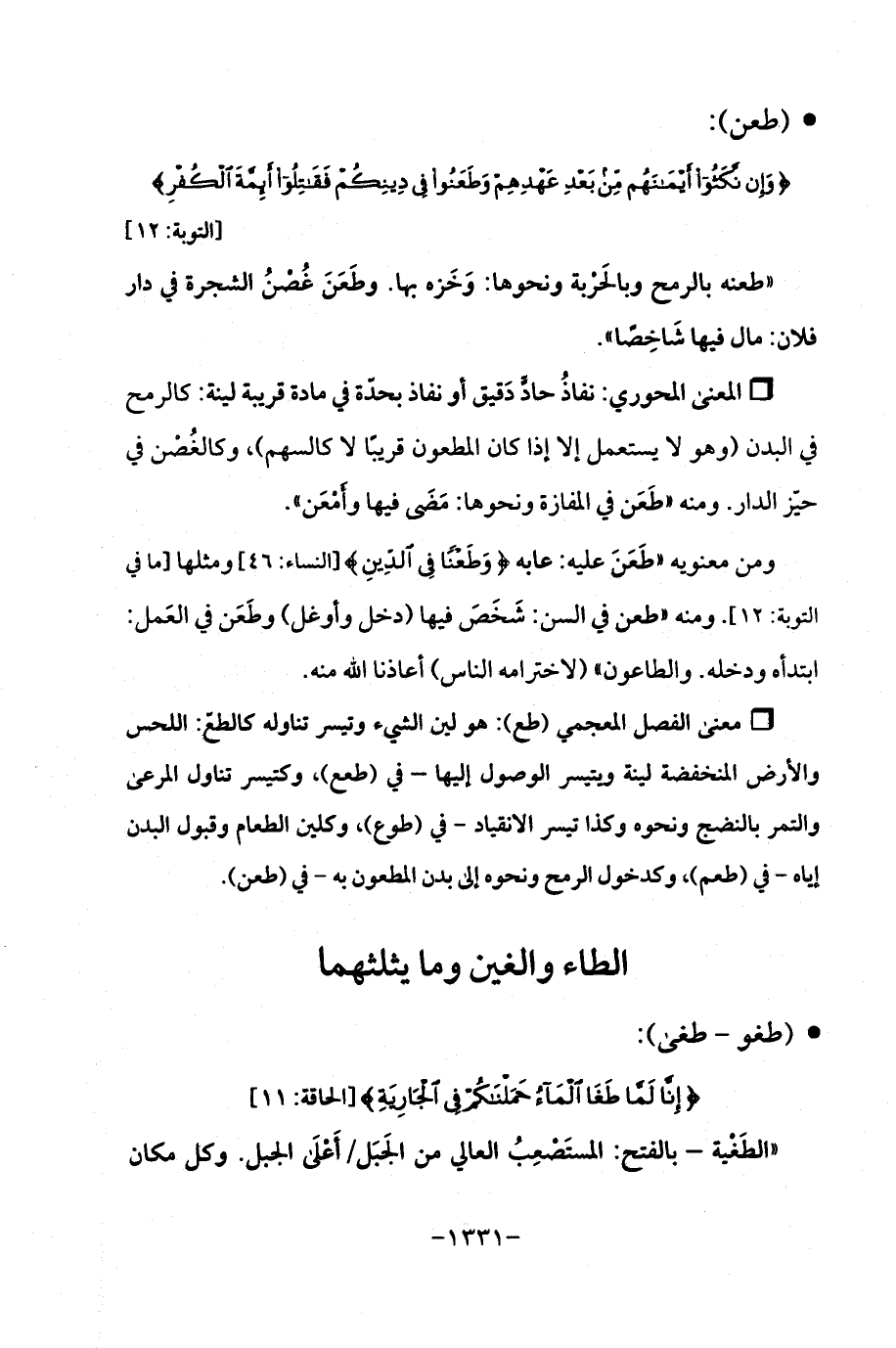 ومن معنويه "طَعَنَ عليه: عابه {وَطَعْنًا فِي الدِّينِ} [النساء: 46] ومثلها [ما في التوبة: 12]. ومنه "طعن في السن: شَخَصَ فيها (دخل وأوغل) وطَعَن في العَمل: ابتدأه ودخله. والطاعون " (لاخترامه الناس) أعاذنا اللَّه منه.