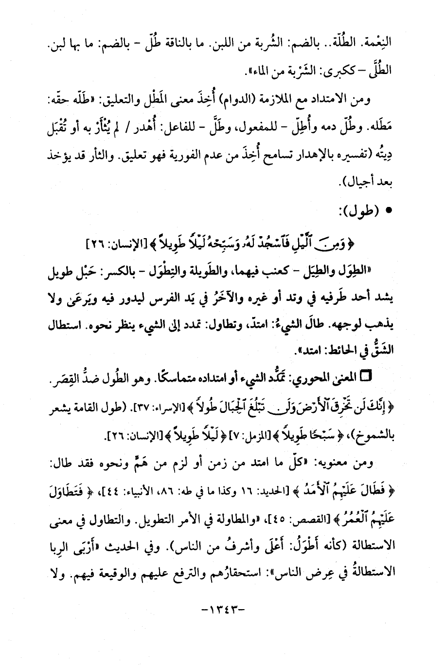 Qتَمَدُّد الشيء أو امتداده متماسكًا. وهو الطُول ضدُّ القِصر. {إِنَّكَ لَنْ تَخْرِقَ الْأَرْضَ وَلَنْ تَبْلُغَ الْجِبَالَ طُولًا} [الإسراء: 37]. (طول القامة يشعر بالشموخ)، {سَبْحًا طَوِيلًا} [المزمل: 7] {لَيْلًا طَوِيلًا} [الإنسان: 26].