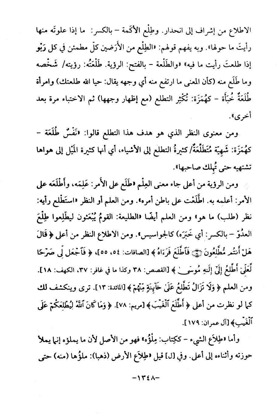 ومن الرؤية من أعلى جاء معنى العِلْم "طَلَع على الأَمر: عَلِمَه، وأطْلَعَه على الأمر: أعلمه به. اطَّلَعْت على باطن أمره ". ومن العلم أو النظر "استَطْلع رأيه: نظر (طلب) ما هو، ومن العلم أيضًا "الطليعة: القومُ يُبْعَثون ليطّلِعوا طِلْعَ العدُوّ -بالكسر: أي خَبرَه) كالجواسيس ". ومن الاطلاع النظر من أعلى {قَالَ هَلْ أَنْتُمْ مُطَّلِعُونَ (54) فَاطَّلَعَ فَرَآهُ} [الصافات: 54 - 55] {فَاجْعَلْ لِي صَرْحًا لَعَلِّي أَطَّلِعُ إِلَى إِلَهِ مُوسَى} [القصص: 38 وكذا ما في غافر: 37، الكهف: 18]. ومن العلم {وَلَا تَزَالُ تَطَّلِعُ عَلَى خَائِنَةٍ مِنْهُمْ} [المائدة: 13]. ترى وينكشف لك كما لو نظرت من أعلى {أَطَّلَعَ الْغَيْبَ} [مريم: 78]. {وَمَا كَانَ اللَّهُ لِيُطْلِعَكُمْ عَلَى الْغَيْبِ} [آل عمران: 179].