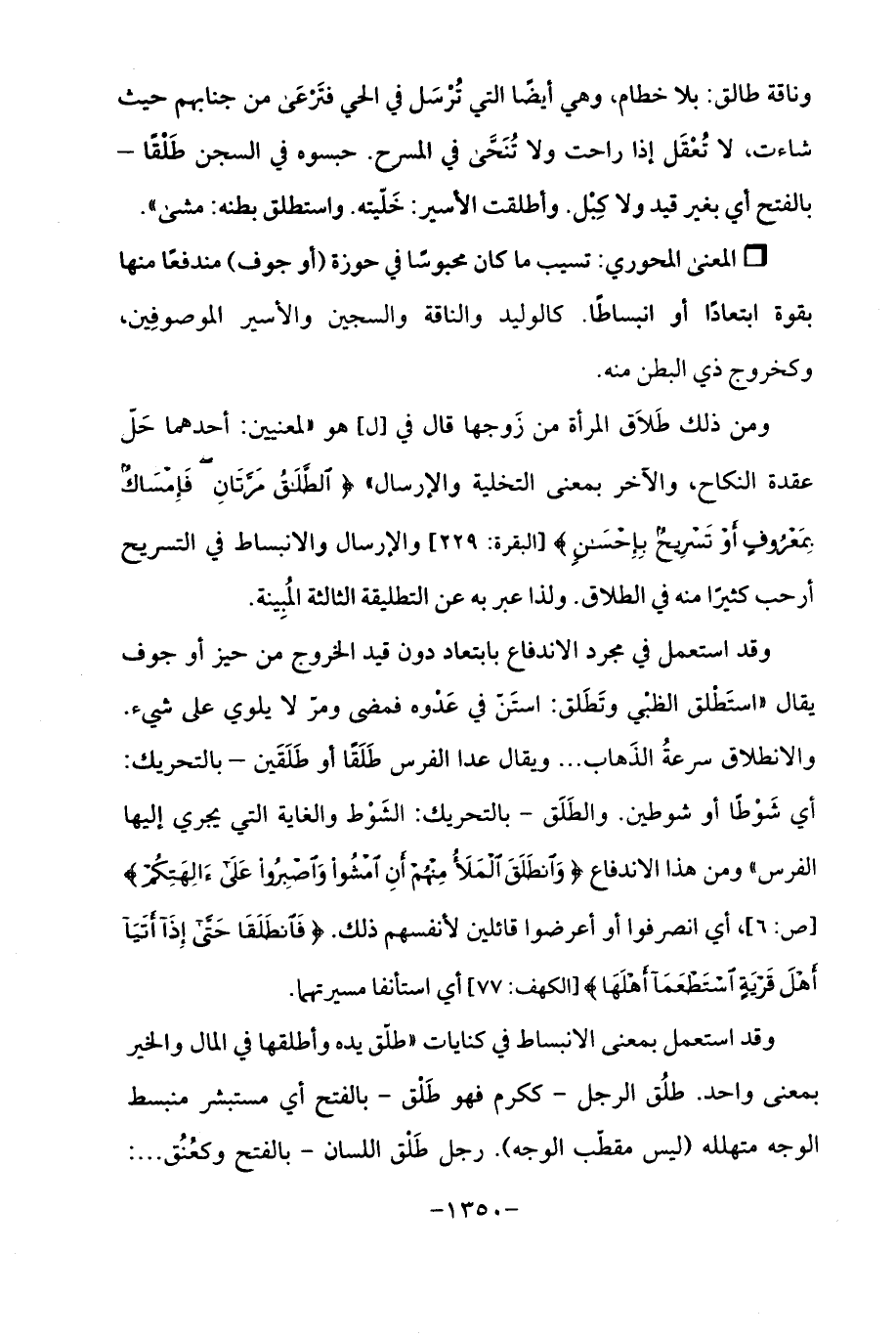 ومن ذلك طَلَاق المرأة من زَوجها قال في [ل] هو "لمعنيين: أحدهما حَلّ عقدة النكاح، والآخر بمعنى التخلية والإرسال " {الطَّلَاقُ مَرَّتَانِ فَإِمْسَاكٌ بِمَعْرُوفٍ أَوْ تَسْرِيحٌ بِإِحْسَانٍ} [البقرة: 229] والإرسال والانبساط في التسريح أرحب كثيرًا منه في الطلاق. ولذا عبر به عن التطليقة الثَّالثة المُبِينة.