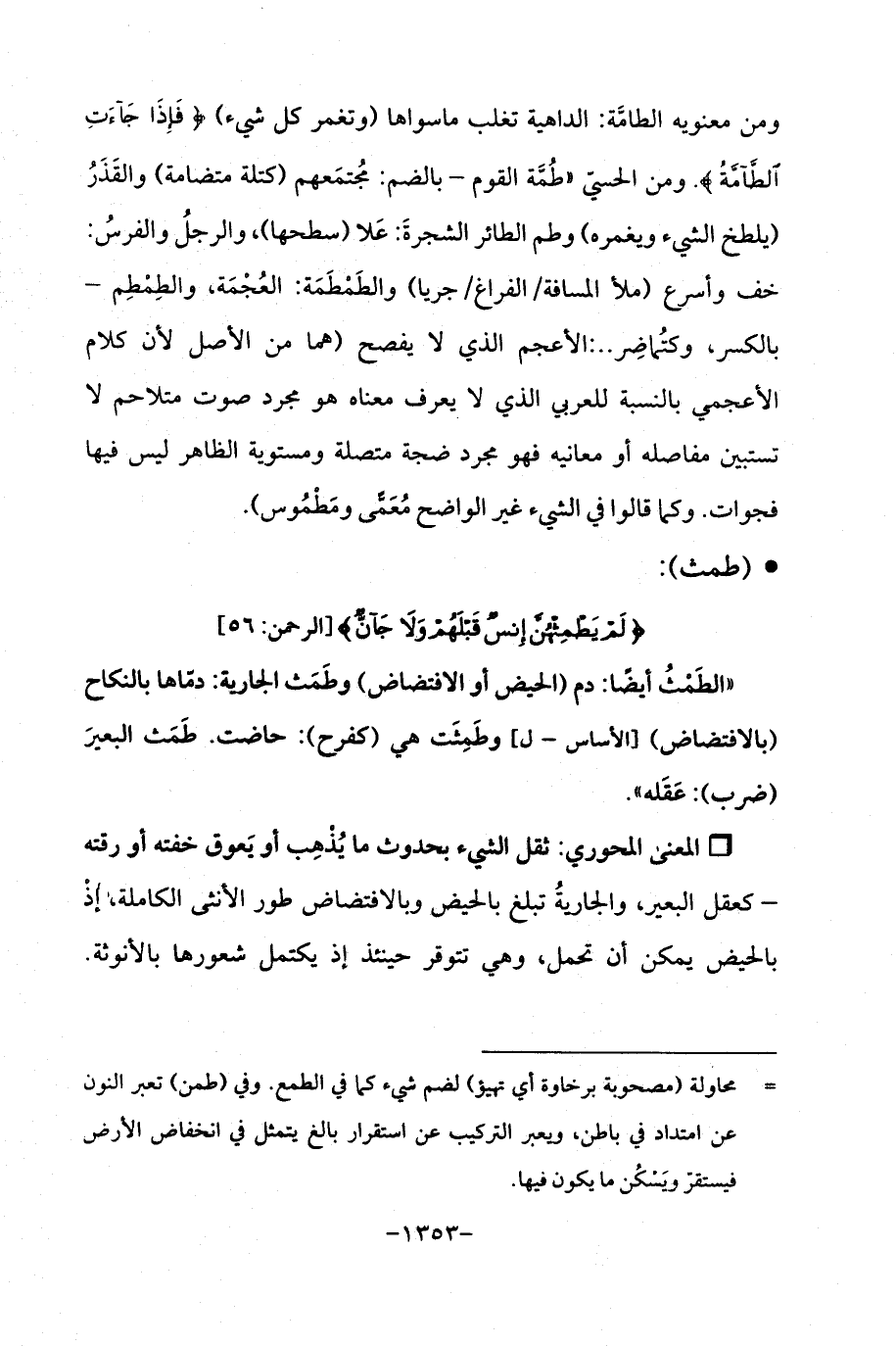 ومن معنويه الطامَّة: الداهية تغلب ما سواها (وتغمر كل شيء) {فَإِذَا جَاءَتِ الطَّامَّةُ}. ومن الحسيّ "طُمَّة القوم -بالضم: مُجتمَعهم (كتلة متضامة) والقَذَرُ (يلطخ الشيء ويغمره) وطم الطائر الشجرةَ: عَلى (سطحها)، والرجلُ والفرسُ: خف وأسرع (ملأ المسافة/ الفراغ/ جريا) والطَمْطَمَة: العُجْمَة، والطِمْطِم -بالكسر، وكتُماضِر. .: الأعجم الذي لا يفصح (هما من الأصل لأن كلام الأعجمي بالنسبة للعربي الذي لا يعرف معناه هو مجرد صوت متلاحم لا تستبين مفاصله أو معانيه فهو مجرد ضجة متصلة ومستوية الظاهر ليس فيها فجوات. وكما قالوا في الشيء غير الواضح مُعَمًّى ومَطْمُوس).