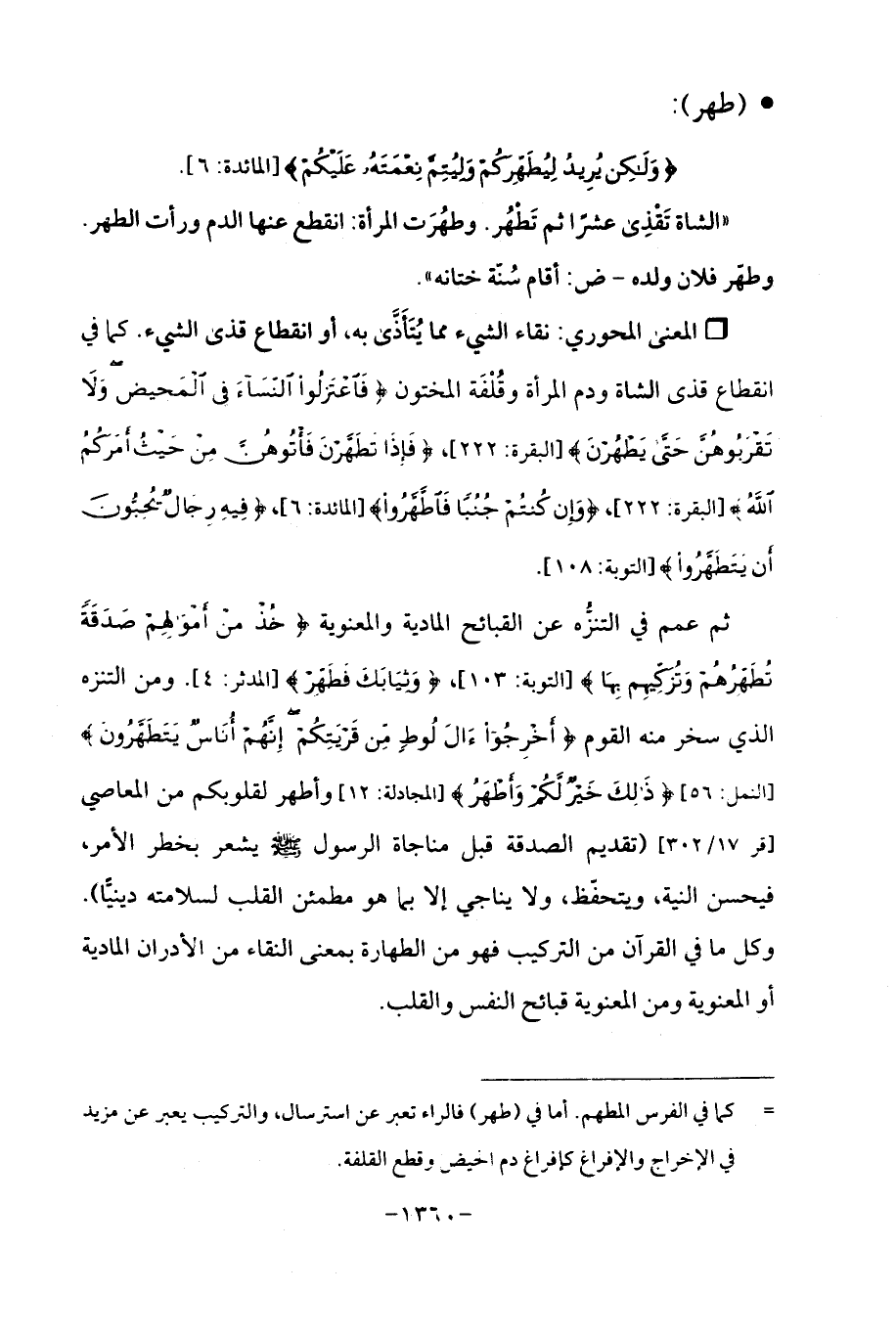 Qنقاء الشيء مما يُتَأَذَّى به، أو انقطاع قذى الشيء. كما في انقطاع قذى الشاة ودم المرأة وقُلْفَة المختون {فَاعْتَزِلُوا النِّسَاءَ فِي الْمَحِيضِ وَلَا تَقْرَبُوهُنَّ حَتَّى يَطْهُرْنَ} [البقرة: 222]، {فَإِذَا تَطَهَّرْنَ فَأْتُوهُنَّ مِنْ حَيْثُ أَمَرَكُمُ اللَّهُ} [البقرة: 222]، {وَإِنْ كُنْتُمْ جُنُبًا فَاطَّهَّرُوا} [المائدة: 6]، {فِيهِ رِجَالٌ يُحِبُّونَ أَنْ يَتَطَهَّرُوا} [التوبة: 108].