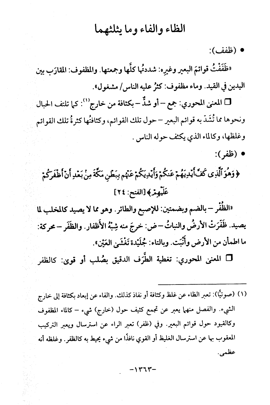 (¬1) (صوتيًّا): تعبر الظاء عن غلظ وكثافة أو نفاذ كذلك. والفاء عن إبعاد بكثافة إلى خارج الشيء. والفصل منهما يعبر عن تجمع كثيف حول (خارج) شيء - كالماء المظفوف وكالقيود حول قوائم البعير. وفي (ظفر) تعبر الراء عن استرسال ويعبر التركيب المعقوب بها عن استرسال الغليظ أو القوي نافذًا من شيء يحيط به كالظفر. وغلظه أنه عظمى.