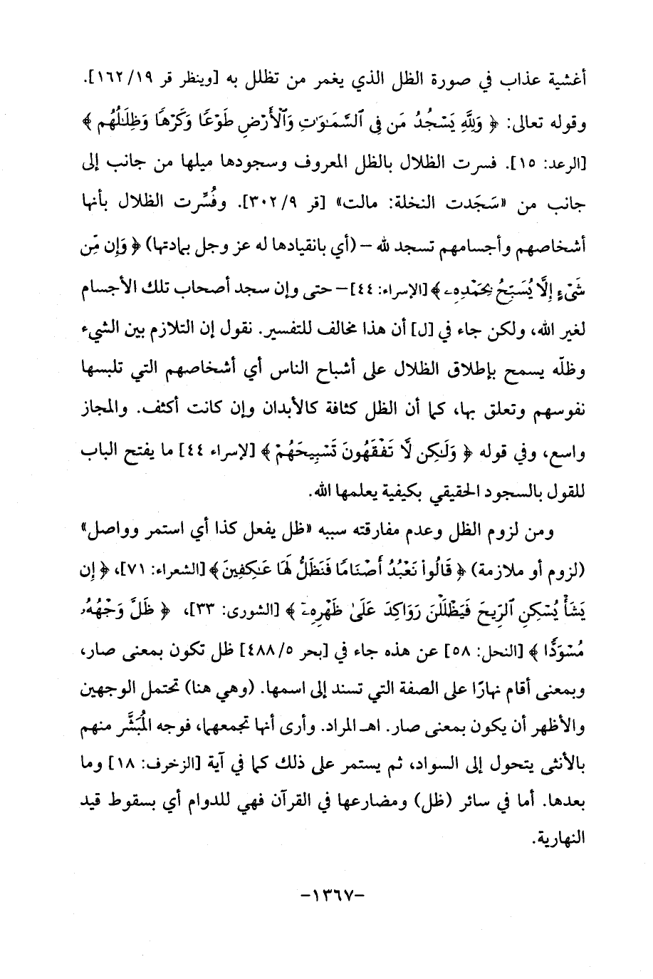 أغشية عذاب في صورة الظل الذي يغمر من تظلل به [وينظر قر 19/ 162]. وقوله تعالى: {وَلِلَّهِ يَسْجُدُ مَنْ فِي السَّمَاوَاتِ وَالْأَرْضِ طَوْعًا وَكَرْهًا وَظِلَالُهُمْ} [الرعد: 15]. فسرت الظلال بالظل المعروف وسجودها ميلها من جانب إلى جانب من "سَجَدت النخلة: مالت " [قر 9/ 302]. وفُسِّرت الظلال بأنها أشخاصهم وأجسامهم تسجد للَّه - (أي بانقيادها له عز وجل بمادتها) {وَإِنْ مِنْ شَيْءٍ إِلَّا يُسَبِّحُ بِحَمْدِهِ} [الإسراء: 44] حتى وإن سجد أصحاب تلك الأجسام لغير اللَّه، ولكن جاء في [ل] أن هذا مخالف للتفسير. نقول إن التلازم بين الشيء وظلّه يسمح بإطلاق الظلال على أشباح الناس أي أشخاصهم التي تلبسها نفوسهم وتعلق بها، كما أن الظل كثافة كالأبدان فإن كانت أكثف. والمجاز واسع، وفي قوله {وَلَكِنْ لَا تَفْقَهُونَ تَسْبِيحَهُمْ} [الإسراء: 44] ما يفتح الباب للقول بالسجود الحقيقي بكيفية يعلمها اللَّه.