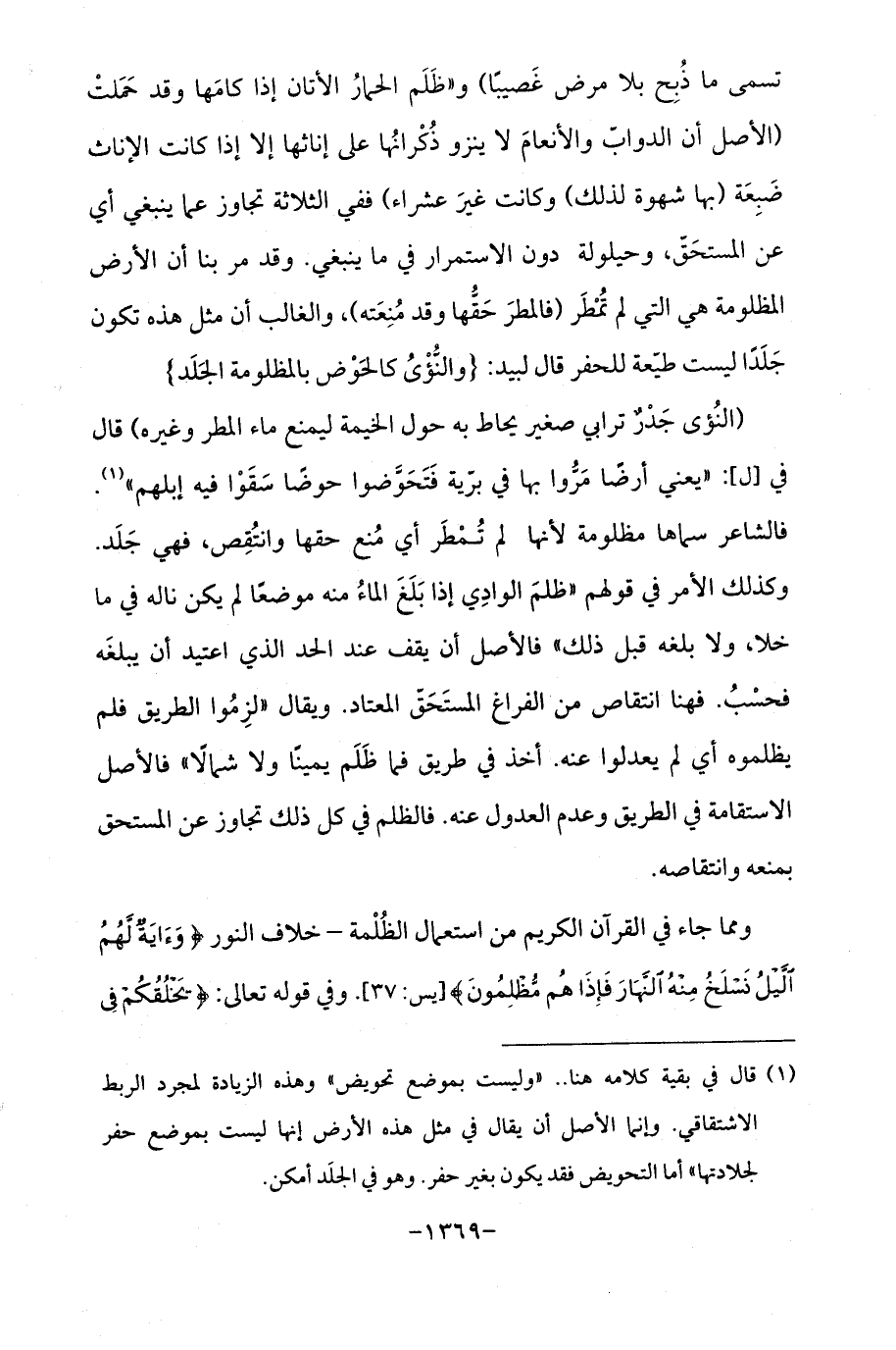 تسمى ما ذُبِح بلا مرض غَصيبًا) و "ظَلَم الحمارُ الأتان إذا كامَها وقد حَمَلتْ (الأصل أن الدوابّ والأنعامَ لا ينزو ذُكْرانُها على إناثها إلا إذا كانت الإناث ضَبِعَة (بها شهوة لذلك) وكانت غيرَ عشراء) ففي الثلاثة تجاوز عما ينبغي أي عن المستحَقَ، وحيلولة دون الاستمرار في ما ينغي. وقد مر بنا أن الأرض المظلومة هي التي لم تُمْطَر (فالمطرَ حَقُّها وقد مُنِعَته)، والغالب أن مثل هذه تكون جَلَدًا ليست طيعة للحفر قال لبيد: {والنُّؤْىُ كالحَوْض بالمظلومة الجَلَد}