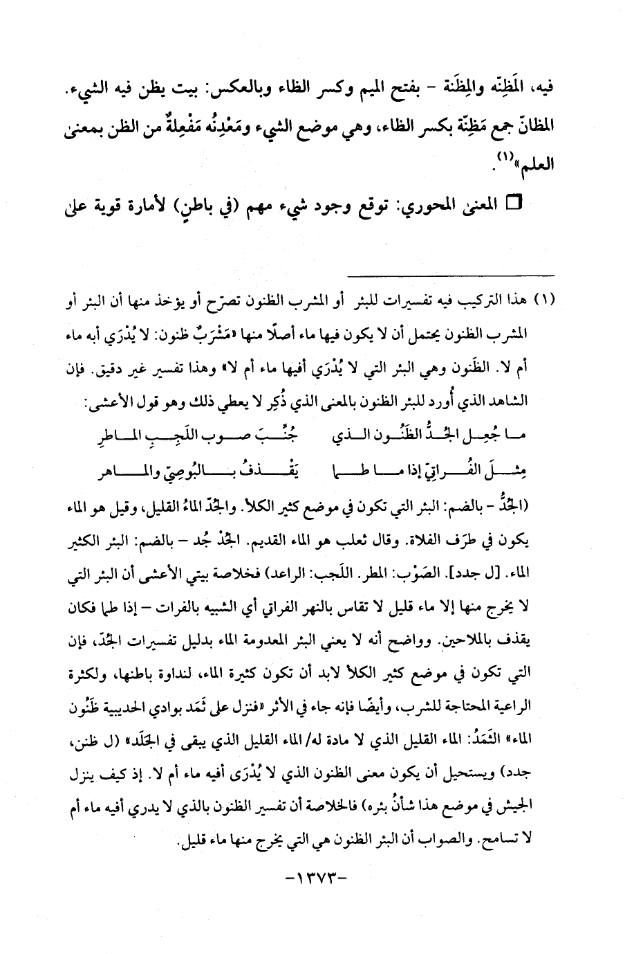 (¬1) هذا التركيب فيه تفسيرات للبئر أو المشرب الظنون تصرّح أو يؤخذ منها أن البئر أو المشرب الظنون يحتمل أن لا يكون فيها ماء أصلًا منها "مَشْرَبٌ ظنون: لا يُدْرَي أبه ماء أم لا. الظَنون وهي البئر التي لا يُدْرَي أفيها ماء أم لا "وهذا تفسير غير دقيق. فإن الشاهد الذي أُورد للبئر الظنون بالمعنى الذي ذُكِر لا يعطي ذلك وهو قول الأعشى: