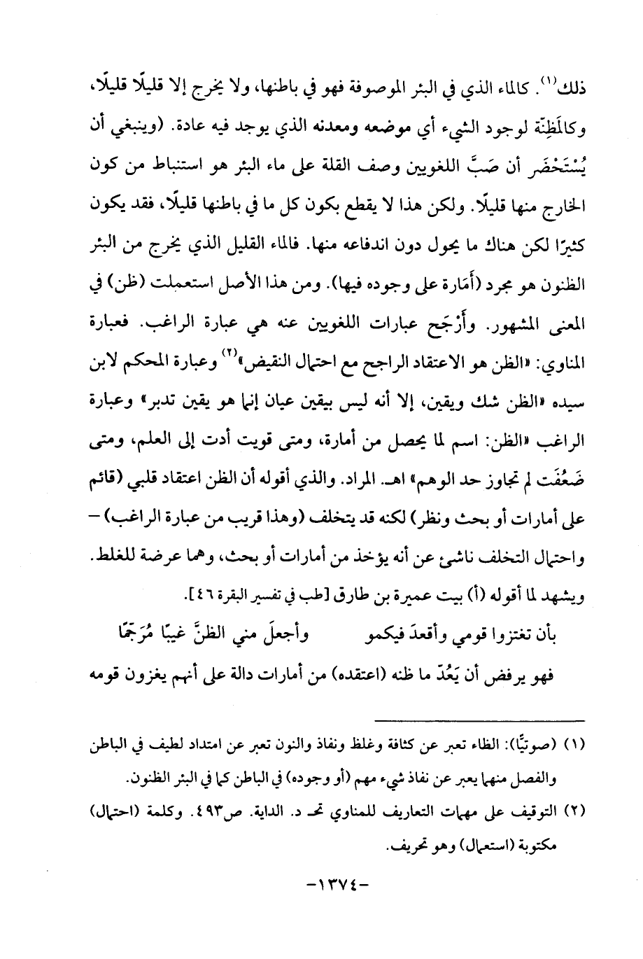 ذلك (¬1). كالماء الذي في البئر الموصوفة فهو في باطنها، ولا يخرج إلا قليلًا قليلًا، وكالمَظِنّة لوجود الشيء أي موضعه ومعدنه الذي يوجد فيه عادة. (وينبغي أن يُسْتَحْضَر أن صَبَّ اللغويين وصف القلة على ماء البئر هو استنباط من كون الخارج منها قليلًا. ولكن هذا لا يقطع بكون كل ما في باطنها قليلًا، فقد يكون كثيرًا لكن هناك ما يحول دون اندفاعه منها. فالماء القليل الذي يخرج من البئر الظنون هو مجرد (أَمَارة على وجوده فيها). ومن هذا الأصل استعملت (ظن) في المعنى المشهور. وأَرْجَح عبارات اللغويين عنه هي عبارة الراغب. فعبارة المناوي: "الظن هو الاعتقاد الراجح مع احتمال النقيض " (¬2) وعبارة المحكم لابن سيده "الظن شك ويقين، إلا أنه ليس بيقين عيان إنما هو يقين تدبر "وعبارة الراغب "الظن: اسم لما يحصل من أمارة، ومتى قويت أدت إلى العلم، ومتى ضَعُفَت لم تجاوز حد الوهم "اهـ. المراد. والذي أقوله أن الظن اعتقاد قلبي (قائم على أمارات أو بحث ونظر) لكنه قد يتخلف (وهذا قريب من عبارة الراغب) - واحتمال التخلف ناشئ عن أنه يؤخذ من أمارات أو بحث، وهما عرضة للغلط. ويشهد لما أقوله (أ) بيت عميرة بن طارق [طب في تفسير البقرة 46].