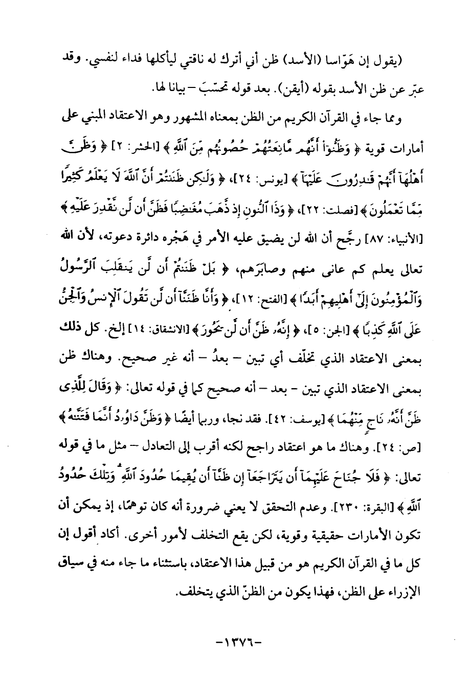 ومما جاء في القرآن الكريم من الظن بمعناه المشهور وهو الاعتقاد المبني على أمارات قوية {وَظَنُّوا أَنَّهُمْ مَانِعَتُهُمْ حُصُونُهُمْ مِنَ اللَّهِ} [الحشر: 2] {وَظَنَّ أَهْلُهَا أَنَّهُمْ قَادِرُونَ عَلَيْهَا} [يونس: 24]، {وَلَكِنْ ظَنَنْتُمْ أَنَّ اللَّهَ لَا يَعْلَمُ كَثِيرًا مِمَّا تَعْمَلُونَ} [فصلت: 22]، {وَذَا النُّونِ إِذْ ذَهَبَ مُغَاضِبًا فَظَنَّ أَنْ لَنْ نَقْدِرَ عَلَيْهِ} [الأنبياء: 87] رجَّح أن اللَّه لن يضيق عليه الأمر في هَجْره دائرة دعوته، لأن اللَّه تعالى يعلم كم عانى منهم وصابَرَهم، {بَلْ ظَنَنْتُمْ أَنْ لَنْ يَنْقَلِبَ الرَّسُولُ وَالْمُؤْمِنُونَ إِلَى أَهْلِيهِمْ أَبَدًا} [الفتح: 12]، {وَأَنَّا ظَنَنَّا أَنْ لَنْ تَقُولَ الْإِنْسُ وَالْجِنُّ عَلَى اللَّهِ كَذِبًا} [الجن: 5]، {إِنَّهُ ظَنَّ أَنْ لَنْ يَحُورَ} [الانشقاق: 14] إلخ. كل ذلك بمعنى الاعتقاد الذي تخلّف أي تبين -بعدُ- أنه غير صحيح. وهناك ظن بمعنى الاعتقاد الذي تبين -بعد- أنه صحيح كما في قوله تعالى: {وَقَالَ لِلَّذِي ظَنَّ أَنَّهُ نَاجٍ مِنْهُمَا} [يوسف: 42]. فقد نجا، وربما أيضًا {وَظَنَّ دَاوُودُ أَنَّمَا فَتَنَّاهُ} [ص: 24]. وهناك ما هو اعتقاد راجح لكنه أقرب إلى التعادل -مثل ما في قوله تعالى: {فَلَا جُنَاحَ عَلَيْهِمَا أَنْ يَتَرَاجَعَا إِنْ ظَنَّا أَنْ يُقِيمَا حُدُودَ اللَّهِ وَتِلْكَ حُدُودُ اللَّهِ} [البقرة: 230]. وعدم التحقق لا يعني ضرورة أنه كان توهمًا، إذ يمكن أن تكون الأمارات حقيقية وقوية، لكن يقع التخلف لأمور أخرى. أكاد أقول إن كل ما في القرآن الكريم هو من قبيل هذا الاعتقاد، باستثناء ما جاء منه في سياق الإزراء على الظن، فهذا يكون من الظنّ الذي يتخلف.