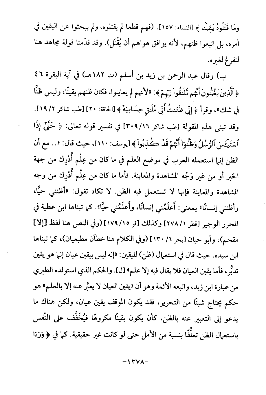 ب) وقال عبد الرحمن بن زيد بن أسلم (ت 182 هـ) في آية البقرة 46 {الَّذِينَ يَظُنُّونَ أَنَّهُمْ مُلَاقُو رَبِّهِمْ}: "لأنهم لم يعاينوا، فكان ظنهم يقينًا، وليس ظنًّا في شك "، وقرأ {إِنِّي ظَنَنْتُ أَنِّي مُلَاقٍ حِسَابِيَهْ} [الحاقة: 20] [طب شاكر 2/ 19]. وقد تبنى هذه المقولة [طب شاكر 16/ 309] في تفسير قوله تعالى: {حَتَّى إِذَا اسْتَيْأَسَ الرُّسُلُ وَظَنُّوا أَنَّهُمْ قَدْ كُذِبُوا} [يوسف: 110]، حيث قال: ". . مع أن الظن إنا استعمله العرب في موضع العلم في ما كان من عِلْم أُدْرِك من جهة الخبر أو من غير وَجْه المشاهدة والمعاينة. فأما ما كان من عِلْم أُدْرِك من وجه المشاهدة والمعاينة فإنها لا تستعمل فيه الظن. لا تكاد تقول: "أظنني حيًّا، وأظنني إنسانًا "بمعنى: أَعلَمُني إنسانًا، وأَعلَمُني حيًّا ". كما تبناها ابن عطية في المحرر الوجيز [قطر 1/ 278] وكذلك [قر 15/ 179] (وفي النص هنا لفظ [إلا] مقحم)، وأبو حيان [بحر 6/ 130] (وفي الكلام هنا خطآن مطبعيان)، كما تبناها ابن سيده. حيث قال في استعمال (ظن) لليقين: "إنه ليس بيقين عيان إنما هو يقين تدبُّر، فأما يقين العيان فلا يقال فيه إلا علم " [ل]. والحكم الذي استولده الطبري من عبارة ابن زيد، واتبعه الأئمة وهو أن "يقين العيان لا يعبَّر عنه إلا بالعلم "هو حكم يحتاج شيئًا من التحرير، فقد يكون الموقف يقين عيان، ولكن هناك ما يدعو إلى التعبير عنه بالظن، كأن يكون يقينًا مكروهًا فيُخَفَّف على النْفس باستعمال الظن تعلُّقًا بنسبة من الأمل حتى لو كانت غير حقيقية. كما في {وَرَأَى