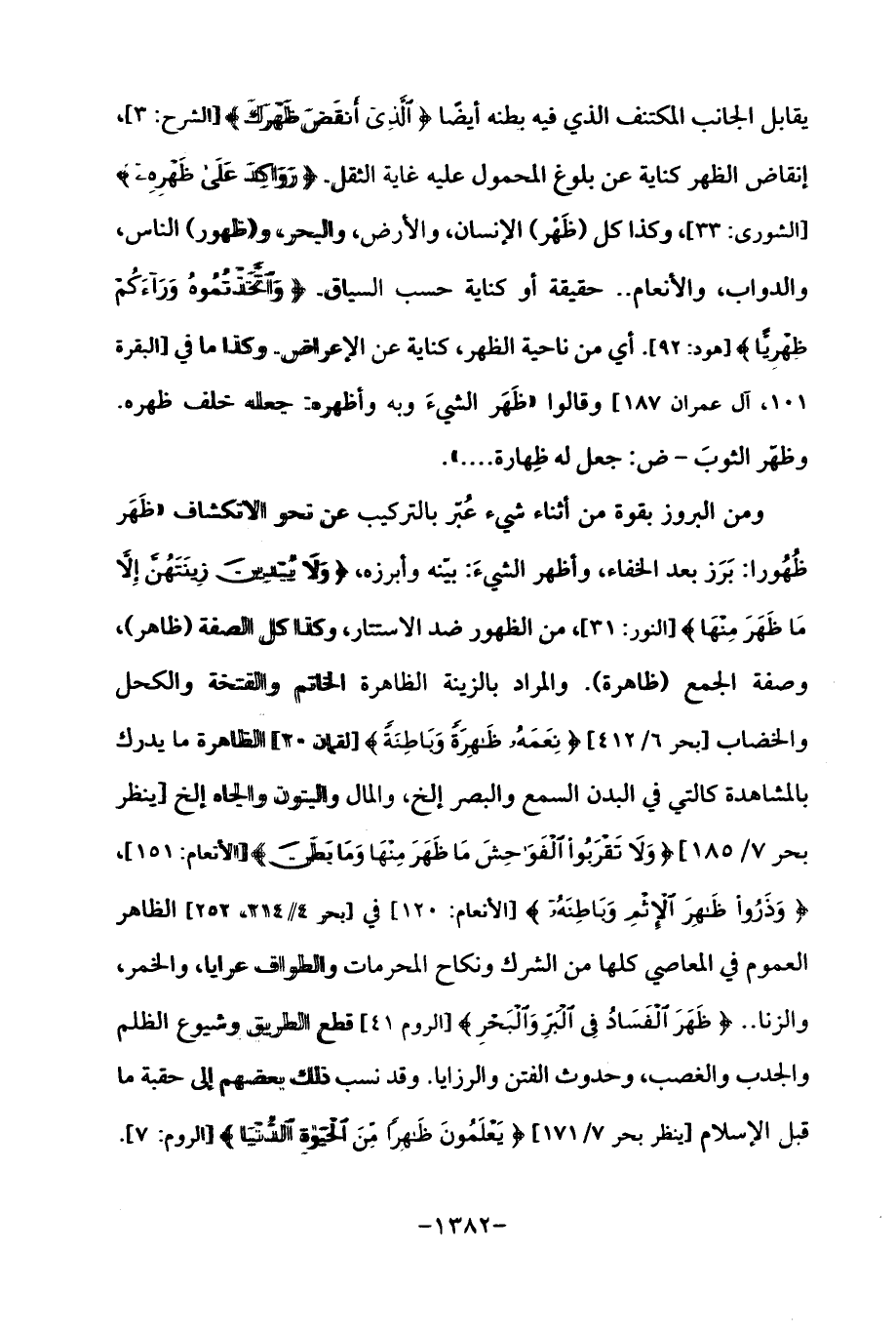 ومن البروز بقوة من أثناء شيء عُبّر بالتركيب عن نحو الانكشاف "ظَهَر ظُهُورا: بَرَز بعد الخفاء، وأظهر الشيءَ: بيّنه وأبرزه، {وَلَا يُبْدِينَ زِينَتَهُنَّ إِلَّا مَا ظَهَرَ مِنْهَا} [النور: 31]، من الظهور ضد الاستتار، وكذا كل الصفة (ظاهر)، وصفة الجمع (ظاهرة). والمراد بالزينة الظاهرة الخاتم والفتخة والكحل والخضاب [بحر 6/ 412] {نِعَمَهُ ظَاهِرَةً وَبَاطِنَةً} [لقمان 20] الظاهر ما يدرك بالمشاهدة كالتى في البدن السمع والبصر إلخ، والمال والبنون والجاه إلخ [ينظر بحر 7/ 185] {وَلَا تَقْرَبُوا الْفَوَاحِشَ مَا ظَهَرَ مِنْهَا وَمَا بَطَنَ} [الأنعام: 151]، {وَذَرُوا ظَاهِرَ الْإِثْمِ وَبَاطِنَهُ} [الأنعام: 120] في [بحر 4/ 214، 252] الظاهر العموم في المعاصي كلها من الشرك ونكاح المحرمات والطواف عرايا، والخمر، والزنا. . {ظَهَرَ الْفَسَادُ فِي الْبَرِّ وَالْبَحْرِ} [الروم: 41] قطع الطريق وشيوع الظلم والجدب والغصب، وحدوث الفتن والرزايا. وقد نسب ذلك بعضهم إلى حقبه ما قبل الإسلام [ينظر بحر 7/ 171] {يَعْلَمُونَ ظَاهِرًا مِنَ الْحَيَاةِ الدُّنْيَا} [الروم: 7].