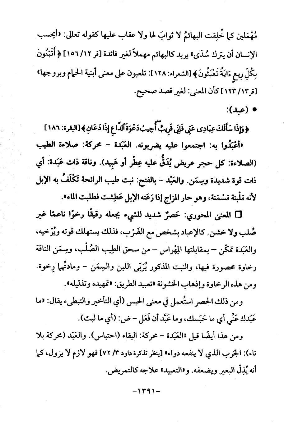 ومن هذا أيضًا قيل "العَبَدة -محركة: البقاء (احتباس). والعَبَد (محركة بلا تاء): الجَرب الذي لا ينفعه دواء " [ينظر تذكرة داود 3/ 72] فهو لازم لا يزول، كما أنَّه يُذِلّ البعير ويضعفه. و "التعبيد "علاجه كالتمريض.