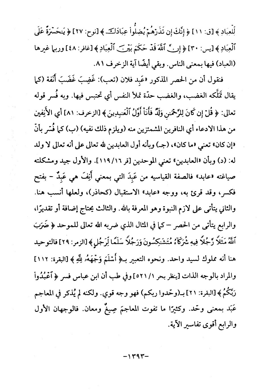 فنقول أن من الحصر المذكور "عَبِد فلان (تعب): غَضِبَ غَضَبَ أَنْفة (كما يقال تَمَلَّكه الغضب، والغضب حدَّة تملأ النفس أي تحتبس فيها. وبه فُسر قوله تعالى: {قُلْ إِنْ كَانَ لِلرَّحْمَنِ وَلَدٌ فَأَنَا أَوَّلُ الْعَابِدِينَ} [الزخرف: 81] أي الأَنِفين من هذا الادعاء أي النافرين المشمئزين منه (ويلزم ذلك نفيه) (ب) كما فُسَّر بأن "إن كان، تعني "ما كان "، (جـ) وبأنه أول العابدين للَّه تعالى على أنَّه تعالى لا ولد له: (د) وبأن "العابدين "تعني الموحدين [قر 16/ 119]. والأول جيد ومشكلته صياغته (عابد) فالصفة القياسيه من عَبِدَ التي بمعنى أَنِفَ هي عَبِدٌ -بفتح فكسر، وقد قرئ به، ووجه "عابد "الاستقبال (كحاذر)، ولعلها أنسب هنا. والثاني يتأتى على لازم النبوة وهو المعرفة باللَّه. والثالث يحتاج إضافة أو تقديرًا، والرابع يتأتى من الحصر - كما في المثال الذي ضربه اللَّه تعالى للموحد {ضَرَبَ اللَّهُ مَثَلًا رَجُلًا فِيهِ شُرَكَاءُ مُتَشَاكِسُونَ وَرَجُلًا سَلَمًا لِرَجُلٍ} [الزمر: 29] فالتوحيد هنا أنَّه مملوك لسيد واحد. ونحوه التعبير بـ {أَسْلَمَ وَجْهَهُ لِلَّهِ} [النساء: 125] والمراد بالوجه الذات [ينظر بحر 1/ 521] وفي طب أن ابن عبَّاس فسر {اعْبُدُوا رَبَّكُمُ} [البقرة: 21] بـ (وحّدوا ربكم) فهو وجه قوي. ولكنه لم يُذكر في المعاجم عَبَد بمعنى وحّد. وكثيرًا ما تفوت المعاجمَ صِيغٌ ومعان. فالوجهان الأول والرابع أقوى تفاسير الآية.