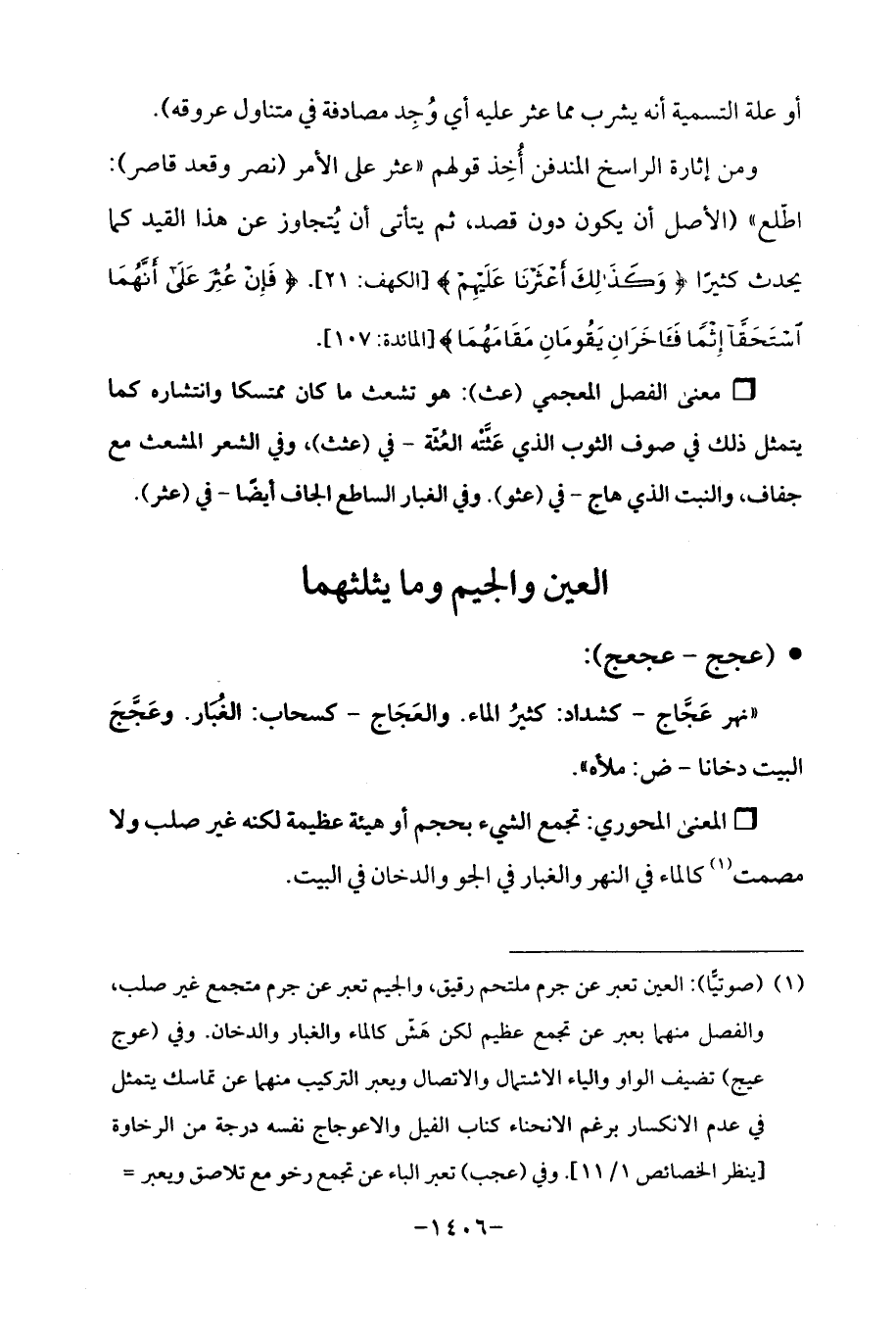 (¬1) (صوتيًّا): العين تعبر عن جرم ملتحم رقيق، والجيم تعبر عن جرم متجمع غير صلب، والفصل منهما يعبر عن تجمع عظيم لكن هَشّ كالماء والغبار والدخان. وفي (عوج عيج) تضيف الواو والياء الاشتمال والاتصال ويعبر التركيب منهما عن تماسك يتمثل في عدم الانكسار برغم الانحناء كتاب الفيل والاعوجاج نفسه درجة من الرخاوة [ينظر الخصائص 1/ 11]. وفي (عجب) تعبر الباء عن تجمع رخو مع تلاصق ويعبر =