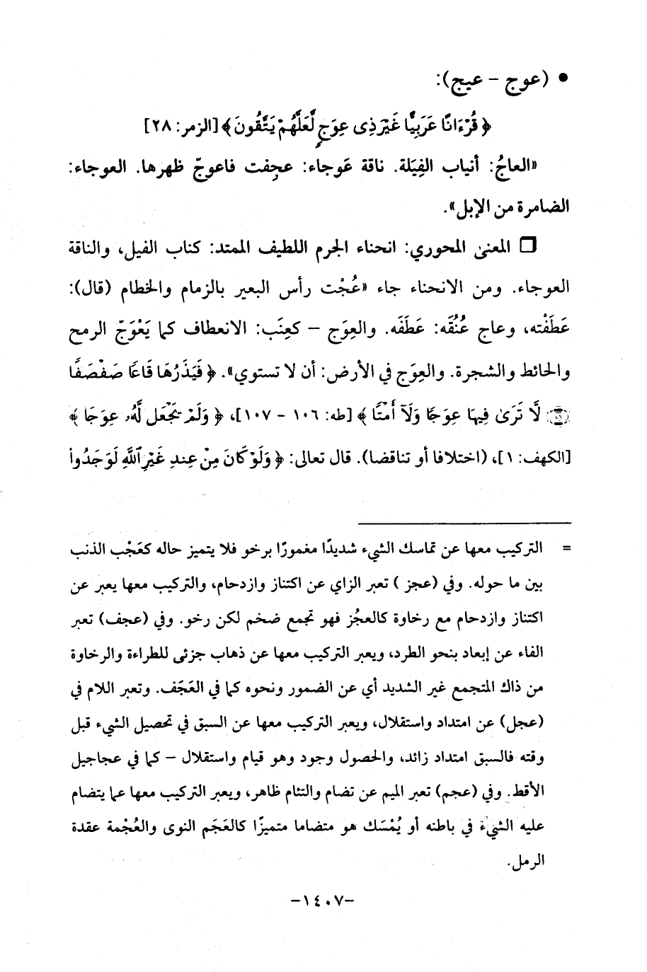 Qانحناء الجرم اللطيف الممتد: كتاب الفيل، والناقة العوجاء. ومن الانحناء جاء "عُجْت رأص البعير بالزمام والخطام (قال): عَطَفْته، وعاج عُنُقَه: عَطَفَه. والعِوَج - كعِنَب: الانعطاف كما يَعْوَجّ الرمح والحائط والشجرة. والعِوَج في الأرض: أن لا تستوي ". {فَيَذَرُهَا قَاعًا صَفْصَفًا (106) لَا تَرَى فِيهَا عِوَجًا وَلَا أَمْتًا} [طه: 106 - 107]، {وَلَمْ يَجْعَلْ لَهُ عِوَجًا} [الكهف: 1]، (اختلافا أو تناقضا). قال تعالى: {وَلَوْ كَانَ مِنْ عِنْدِ غَيْرِ اللَّهِ لَوَجَدُوا