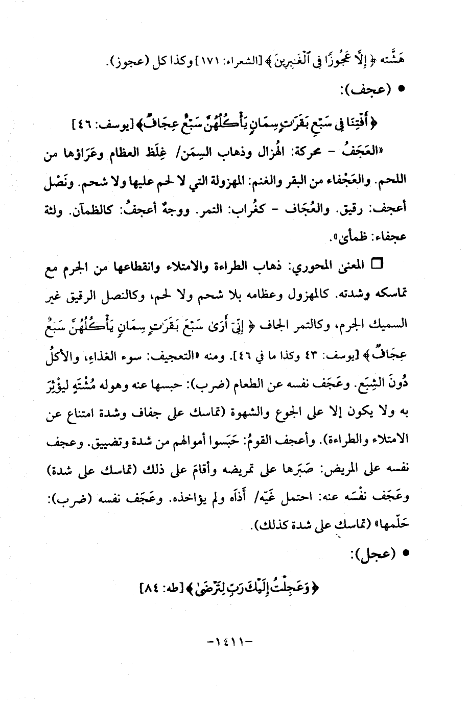 Qذهاب الطراءة والامتلاء وانقطاعها من الجرم مع تماسكه وشدته. كالمهزول وعظامه بلا شحم ولا لحم، وكالنصل الرقيق غير السميك الجرم، وكالتمر الجاف {إِنِّي أَرَى سَبْعَ بَقَرَاتٍ سِمَانٍ يَأْكُلُهُنَّ سَبْعٌ عِجَافٌ} [يوسف: 43 وكذا ما في 46]. ومنه "التعجيف: سوء الغذاءِ، والأكلُ دُونَ الشِبَع. وعَجَف نفسه عن الطعام (ضرب): حبسها عنه وهوله مُشْتَهٍ ليؤْثِرَ به ولا يكون إلا على الجوع والشهوة (تماسك على جفاف وشدة امتناع عن الامتلاء والطراءة). وأعجف القومُ: حَبَسوا أموالهم من شدة وتضييق. وعجف نفسه على المريض: صَبَرها على تمريضه وأقامَ على ذلك (تماسك على شدة) وعَجَف نفْسَه عنه: احتمل غَيّه/ أَذَاه ولم يؤاخذه. وعَجَف نفسه (ضرب): حَلّمها " (تماسك على شدة كذلك).