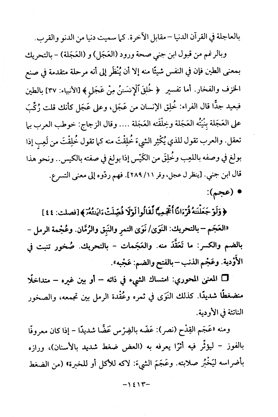 وبالرغم من قبول ابن جني صحة ورود (العَجَل) و (العَجَلة) -بالتحريك بمعنى الطين فإن في النفس شيئًا منه إلا أن يُنْظَر إلى أنه مرحلة متقدمة في صنع الخزف والفخار. أما تفسير {خُلِقَ الْإِنْسَانُ مِنْ عَجَلٍ} [الأنبياء: 37] بالطين فبعيد جدًّا قال الفراء: خُلِق الإنسان من عَجَل، وعلى عَجَل كأنك قلت رُكِّبَ على العَجَلة بِنْيَتُه العَجَلة وخِلْقَته العَجَلة. . . . وقال الزجاج: خوطب العرب بما تعقل. والعرب تقول للذي يُكْثِر الشيءَ خُلِقْتَ منه كما تقول خُلِقْتَ من لَعِبٍ إذا بولغ في وصفه باللعِب وخُلِقَ من الكَيْس إذا بولغ في صفته بالكيس. . ونحو هذا قال ابن جني. [ينظر ل عجل، وقر 11/ 289]. فهم ردّوه إلى معنى التسرع.
