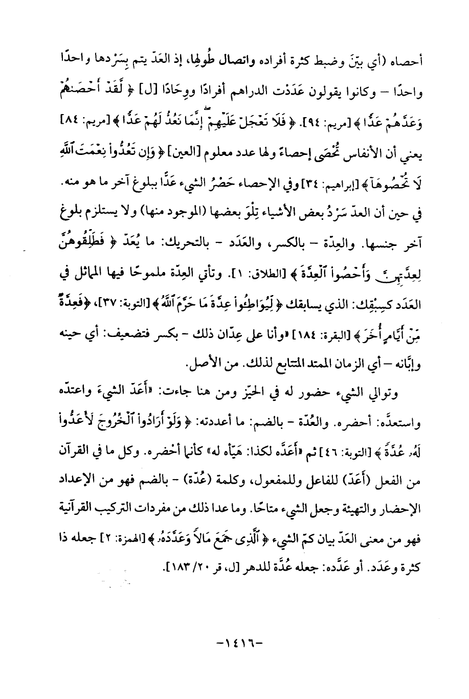 أحصاه (أي بيَنَ وضبط كثرة أفراده واتصال طُولهِا، إذ العدّ يتم بِسَردها واحدًا واحدًا - وكانوا يقولون عَدَدْت الدراهم أفرادًا ووِحَادًا [ل] {لَقَدْ أَحْصَاهُمْ وَعَدَّهُمْ عَدًّا} [مريم: 94]. {فَلَا تَعْجَلْ عَلَيْهِمْ إِنَّمَا نَعُدُّ لَهُمْ عَدًّا} [مريم: 84] يعني أن الأنفاس تُحْصَى إحصاءً ولها عدد معلوم [العين] {وَإِنْ تَعُدُّوا نِعْمَتَ اللَّهِ لَا تُحْصُوهَا} [إبراهيم: 34] وفي الإحصاء حَصْرُ الشيء عَدًّا ببلوغ آخر ما هو منه. في حين أن العدّ سَرْدُ بعض الأشياء تِلْوَ بعضها (الموجود منها) ولا يستلزم بلوغ آخر جنسها. والعِدّة -بالكسر، والعَدَد -بالتحريك: ما يُعَدّ {فَطَلِّقُوهُنَّ لِعِدَّتِهِنَّ وَأَحْصُوا الْعِدَّةَ} [الطلاق: 1]. وتأتي العِدّة ملموحًا فيها المماثل في العَدَد كسِبْقِك: الذي يسابقك {لِيُوَاطِئُوا عِدَّةَ مَا حَرَّمَ اللَّهُ} [التوبة: 37]، {فَعِدَّةٌ مِنْ أَيَّامٍ أُخَرَ} [البقرة: 184] "وأنا على عِدّان ذلك -بكسر فتضعيف: أي حينه وإبَّانه -أي الزمان الممتد المتتابع لذلك. من الأصل.