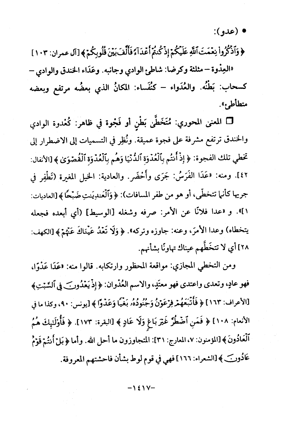 ومن التخطي المجازي: مواقعة المحظور وارتكابه. قالوا منه: "عَدَا عَدْوَا، فهو عادٍ، وتعدى واعتدى فهو معتَدٍ، والاسم العُدوان: {إِذْ يَعْدُونَ فِي السَّبْتِ} [الأعراف: 163] {فَأَتْبَعَهُمْ فِرْعَوْنُ وَجُنُودُهُ بَغْيًا وَعَدْوًا} [يونس: 90، وكذا ما في الأنعام: 108] {فَمَنِ اضْطُرَّ غَيْرَ بَاغٍ وَلَا عَادٍ} [البقرة: 173]. {فَأُولَئِكَ هُمُ الْعَادُونَ} [المؤمنون: 7، المعارج: 31]: المتجاوزون ما أحل اللَّه. وأمَّا {بَلْ أَنْتُمْ قَوْمٌ عَادُونَ} [الشعراء: 166] فهي في قوم لوط بشأن فاحشتهم المعروفة.