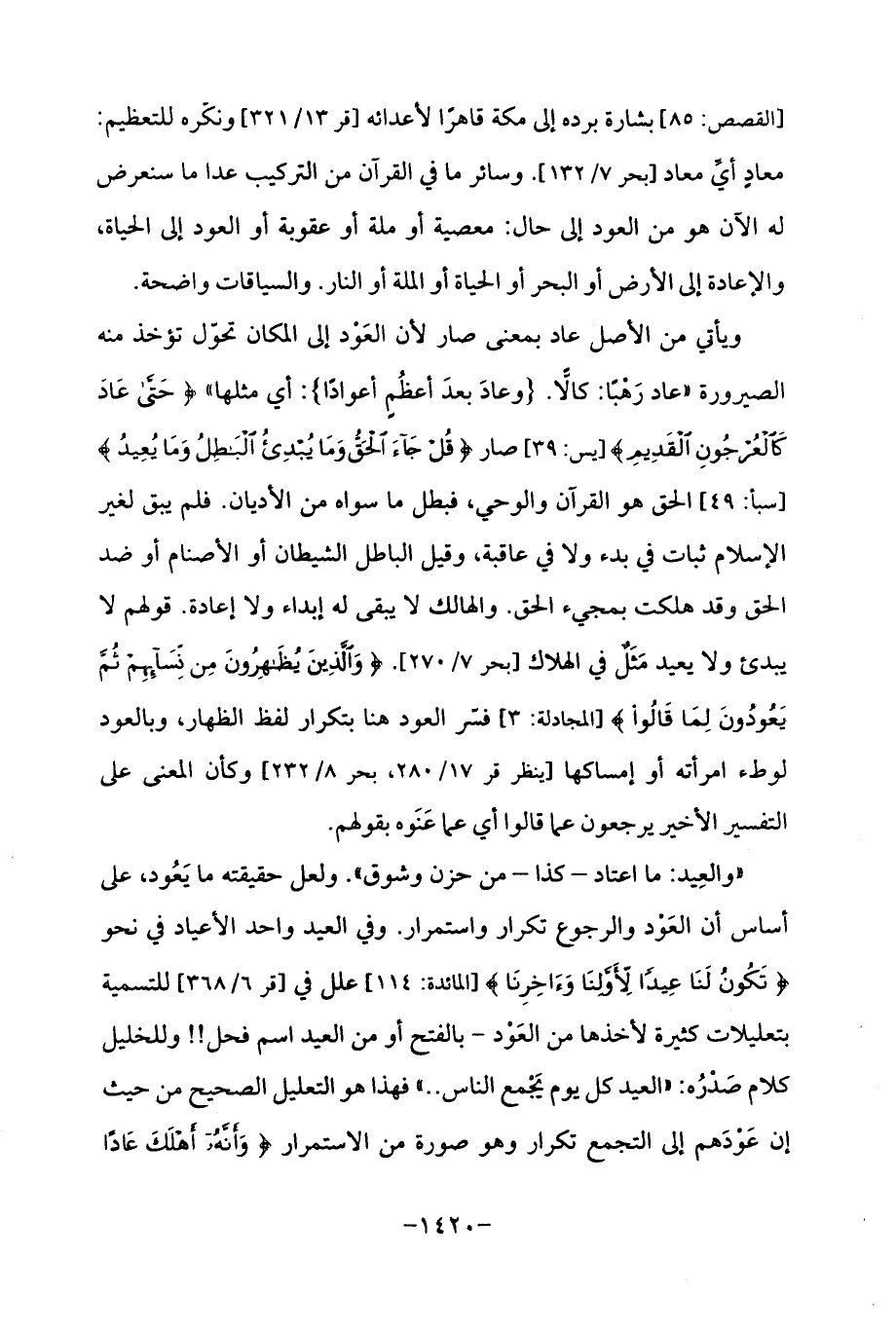 [القصص: 85] بشارة برده إلى مكّة قاهرًا لاعدائه [قر 13/ 321] ونكّره للتعظيم: معادٍ أيِّ معاد [بحر 7/ 132]. وسائر ما في القرآن من التركيب عدا ما سنعرض له الآن هو من العود إلى حال: معصية أو ملة أو عقوبة أو العود إلى الحياة، والإعادة إلى الأرض أو البحر أو الحياة أو الملة أو النَّار. والسياقات واضحة.