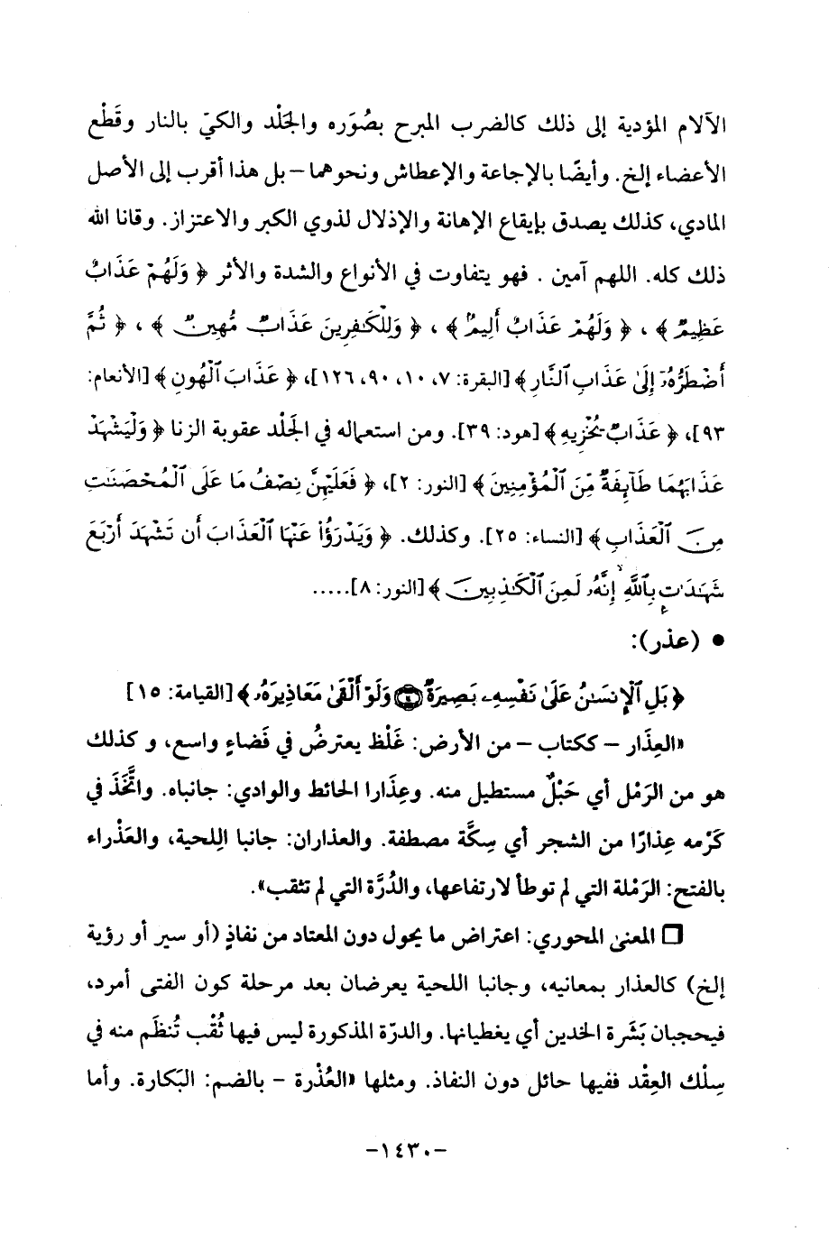 الآلام المؤدية إلى ذلك كالضرب المبرح بصُوَره والجَلْد والكيّ بالنار وقَطْع الأعضاء إلخ. وأيضًا بالإجاعة والإعطاش ونحوهما - بل هذا أقرب إلى الأصل المادي، كذلك يصدق بإيقاع الإهانة والإذلال لذوي الكبر والاعتزاز. وقانا اللَّه ذلك كله. اللَّهم آمين. فهو يتفاوت في الأنواع والشدة والأثر {وَلَهُمْ عَذَابٌ عَظِيمٌ}، {وَلَهُمْ عَذَابٌ أَلِيمٌ}، {وَلِلْكَافِرِينَ عَذَابٌ مُهِينٌ}، {ثُمَّ أَضْطَرُّهُ إِلَى عَذَابِ النَّارِ} [البقرة: 7، 10، 90، 126] {عَذَابَ الْهُونِ} [الأنعام: 93] {عَذَابٌ يُخْزِيهِ} [هود: 39]. ومن استعماله في الجَلْد عقوبة الزنا {وَلْيَشْهَدْ عَذَابَهُمَا طَائِفَةٌ مِنَ الْمُؤْمِنِينَ} [النور: 2]، {فَعَلَيْهِنَّ نِصْفُ مَا عَلَى الْمُحْصَنَاتِ مِنَ الْعَذَابِ} [النساء: 25]. وكذلك. {وَيَدْرَأُ عَنْهَا الْعَذَابَ أَنْ تَشْهَدَ أَرْبَعَ شَهَادَاتٍ بِاللَّهِ إِنَّهُ لَمِنَ الْكَاذِبِينَ} [النور: 8]. . .