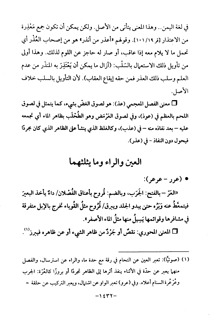 (¬1) (صوتيًّا): تعبر العين عن التحام في رقة مع حدة ما، والراء عن استرسال، والفصل منهما يعبر عن حدّة في الأثناء ينفذ أثرها إلى الظاهر تجردًا أو بروزًا كالعُرّة: الجرب وعُرْعُرة السنام أعلاه. وفي (عرو) تعبر الراو عن اشتمال، ويعبر التركيب عن حلقة =