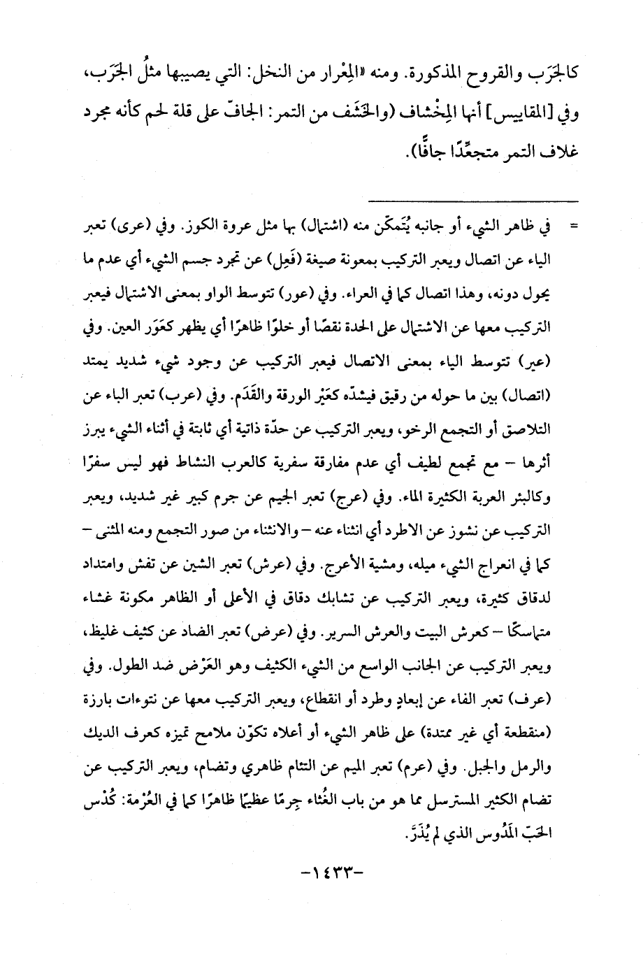 = في ظاهر الشيء أو جانبه يُتَمكّن منه (اشتمال) بها مثل عروة الكوز. وفي (عرى) تعبر الياء عن اتصال ويعبر التركيب بمعونة صيغة (فَعِل) عن تجرد جسم الشيء أي عدم ما يحول دونه، وهذا اتصال كما في العراء. وفي (عور) تتوسط الواو بمعنى الاشتمال فيعبر التركيب معها عن الاشتمال على الحدة نقصًا أو خلوًا ظاهرًا أي يظهر كعَوَر العين. وفي (عير) تتوسط الياء بمعنى الاتصال فيعبر التركيب عن وجود شيء شديد يمتد (اتصال) بين ما حوله من رقيق فيشدّه كعَيْر الورقة والقَدَم. وفي (عرب) تعبر الباء عن التلاصق أو التجمع الرخو، ويعبر التركيب عن حدّة ذاتية أي ثابتة في أثناء الشيء يبرز أثرها - مع تجمع لطيف أي عدم مفارقة صفرية كالعرب النشاط فهو ليس صفرًا وكالبئر العربة الكثيرة الماء. وفي (عرج) تعبر الجيم عن جرم كبير غير شديد، ويعبر التركيب عن نشوز عن الاطرد أي انثناء عنه -والانثناء من صور التجمع ومنه المثنى- كما في انعراج الشيء ميله، ومشية الأعرج. وفي (عرش) تعبر الشين عن تفش وامتداد لدقاق كثيرة، ويعبر التركيب عن تشابك دقاق في الأعلى أو الظاهر مكونة غشاء متماسكًا - كعرش البيت والعرش السرير. وفي (عرض) تعبر الضاد عن كثيف غليظ، ويعبر التركيب عن الجانب الواسع من الشيء الكثيف وهو العَرْض ضد الطول. وفي (عرف) تعبر الفاء عن إبعادٍ وطرد أو انقطاع، ويعبر التركيب معها عن نتوءات بارزة (منقطعة أي غير ممتدة) على ظاهر الشيء أو أعلاه تكوّن ملامح تميزه كعرف الديك والرمل والجبل. وفي (عرم) تعبر الميم عن التئام ظاهري وتضام، ويعبر التركيب عن تضام الكثير المسترسل مما هو من باب الغُثاء جِرمًا عظيمًا ظاهرًا كما في العُرْمة: كُدْس الحَبّ المَدُوس الذي لم يُذَرَّ.