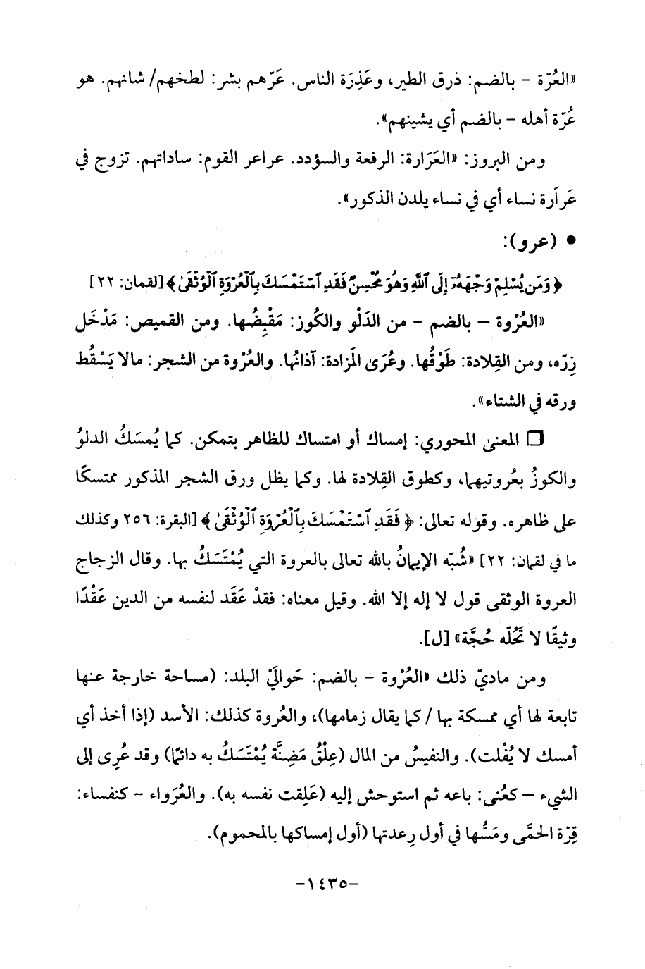 Qإمساك أو امتساك للظاهر بتمكن. كما يُمسَكُ الدلوُ والكوزُ بعُروتيهما، وكطوق القِلادة لها. وكما يظل ورق الشجر المذكور ممتسكًا على ظاهره. وقوله تعالى: {فَقَدِ اسْتَمْسَكَ بِالْعُرْوَةِ الْوُثْقَى} [البقرة: 256 وكذلك ما في لقمان: 22] "شُبّه الإيمانُ باللَّه تعالى بالعروة التي يُمْتَسَكُ بها. وقال الزجاج العروة الوثقى قول لا إله إلا اللَّه. وقيل معناه: فقدْ عَقَد لنفسه من الدين عَقْدًا وثيقًا لا تَحُلّه حُجَّة " [ل].