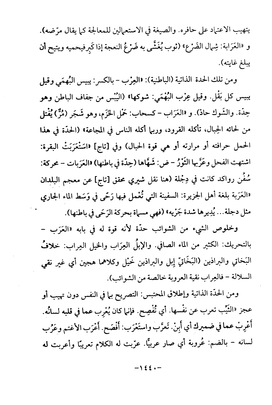 ومن تلك الحدة الذاتية (الباطنية): (العِرْب -بالكسر: يبيس البُهمَي وقيل يبيس كل بَقْل. وقيل عِزب البُهْمَي: شوكها " (اليُبْس من جفاف الباطن وهو حِدّة. والشَوك حادّ). و "العَرَاب - كسحاب: حَمْل الخَزَم، وهو شَجَر (مُرٌّ) يُفْتل من لحائه الحِبال، تأكله القرود، وربا أكله الناس في المجاعة " (الحدّة في هذا الحمل حرافته أو مرارته أو هي قوة الحبال) وفي [تاج] "اسَتْعَرَبَت البقرة: اشتهت الفحل وعَرَّبها الثَوْرُ - ض: شَهَّاها (حِدّة في باطنها) "العَرَبات -محركة: سُفُن رواكد كانت في دِجْلة (هنا نقل شيري محقق [تاج] عن معجم البلدان "العَرَبة بلغة أهل الجزيرة: السفينة التي تُعْمل فيها رَحى في وَسَط الماء الجاري مثل دجلة. . . يُدِيرها شدة جَرْيه " (فهي مسماة بحركة الرَحَى في باطنها).