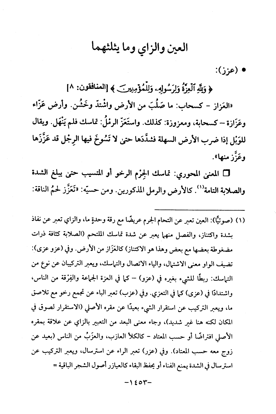 (¬1) (صوتيًّا): العين تعبر عن التحام الجرم عريضًا مع رقة وحدةٍ ما، والزاي تعبر عن نفاذ بشدة واكتناز، والفصل منهما يعبر عن شدة تماسك الملتحم (الصلابة كثافة ذرات مضغوطة بعضها مع بعض وهذا هو الاكتناز) كالعَزَاز من الأرض. وفي (عزو عزى): تضيف الواو معنى الاشتمال. والياء الاتصال والتماسك، ويعبر التركيبان عن نوع من التماسك: ربطا للشيء بغيره في (عزو) -كما في العزة الجماعة والفِرْقة من الناس، واشتدادًا في (عزى) كما في التعزي. وفي (عزب) تعبر الباء عن تجمع رخو مع تلاصق ما، ويعبر التركيب عن استقرار الشيء بعيدًا عن مقره الأصلي (الاستقرار لصوق في المكان لكنه هنا غير شديد)، وجاء معنى البعد من التعبير بالزاي عن علاقة بمقره الأصلي افتراضًا أو حسب المعتاد - كالكلأ العازب، والعزَبُ من الناس (بعيد عن زوج معه حسب المعتاد). وفي (عزر) تعبر الراء عن استرسال. ويعبر التركيب عن استرسال في الشدة يمنع الفاء أو يحفظ البقاء كالعيازر أصول الشجر الباقية =