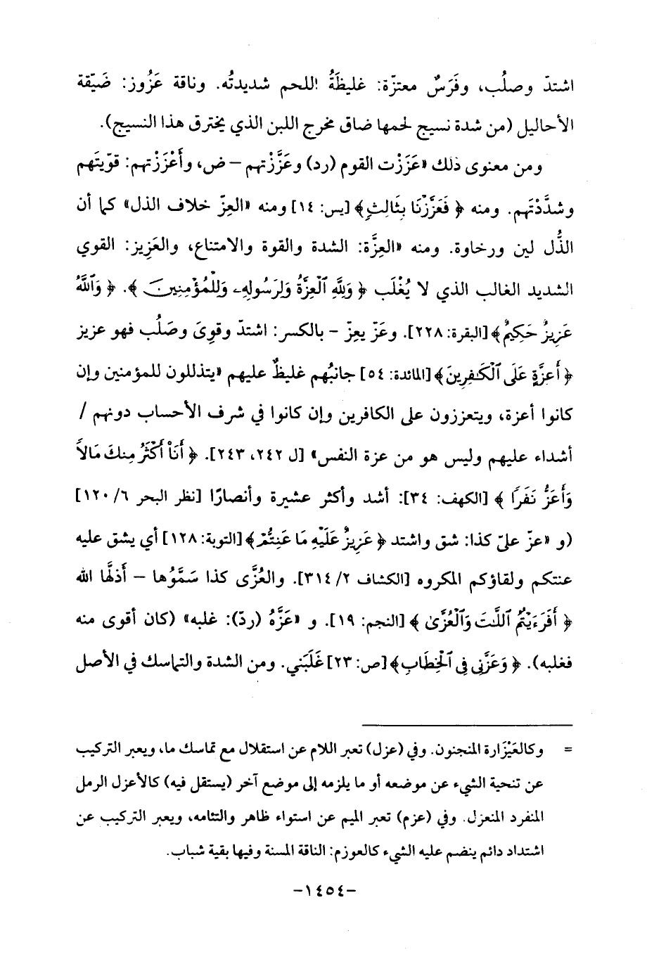 ومن معنوى ذلك "عَزَزْت القوم (رد) وعَزَّزْتهم - ض، وأعْزَزْتهم: قوّيتَهم وشدَّدْتَهم. ومنه {فَعَزَّزْنَا بِثَالِثٍ} [يس: 14] ومنه "العِزّ خلاف الذل "كما أن الذُّل لين ورخاوة. ومنه "العِزَّة: الشدة والقوة والامتناع، والعَزِيز: القوي الشديد الغالب الذي لا يُغْلَب {وَلِلَّهِ الْعِزَّةُ وَلِرَسُولِهِ وَلِلْمُؤْمِنِينَ}. {وَاللَّهَ عَزِيزٌ حَكِيمٌ} [البقرة: 228]. وعَزَّ يعِزّ -بالكسر: اشتدّ وقوِىَ وصَلُب فهو عزيز {أَعِزَّةٍ عَلَى الْكَافِرِينَ} [المائدة: 54] جانبُهم غليظٌ عليهم "يتذللون للمؤمنين وإن كانوا أعزة، ويتعززون على الكافرين وإن كانوا في شرف الأحساب دونهم/ أشداء عليهم وليس هو من عزة النفس " [ل 242، 243]. {أَنَا أَكْثَرُ مِنْكَ مَالًا وَأَعَزُّ نَفَرًا} [الكهف: 34]: أشد وأكثر عشيرة وأنصارًا [نظر البحر 6/ 120] (و "عز على كذا: شق واشتد {عَزِيزٌ عَلَيْهِ مَاعَنِتُّمْ} [التوبة: 128] أي يشق عليه عنتكم ولقاؤكم المكروه [الكشاف 2/ 314]. والعُزَّى كذا سَمَّوُها - أذلَّها اللَّه {أَفَرَأَيْتُمُ اللَّاتَ وَالْعُزَّى} [النجم: 19]. و "عَزَّهُ (ردّ): غلبه " (كان أقوى منه فغلبه). {وَعَزَّنِي فِي الْخِطَابِ} [ص: 23] غَلَبَني. ومن الشدة والتماسك في الأصل