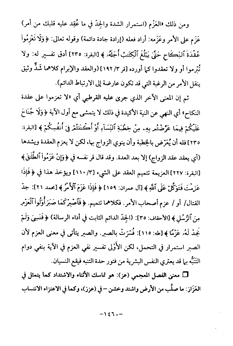 ومن ذلك "العَزْم (استمرار الشدة والجِدّ في ما عُقِد عليه قلبك من أمر) عَزَم على الأمر وعَزَمه: أراد فعله (إرادة جادة دائمة) وقوله تعالى: {وَلَا تَعْزِمُوا عُقْدَةَ النِّكَاحِ حَتَّى يَبْلُغَ الْكِتَابُ أَجَلَهُ} [البقرة: 235] أدق تفسير له: ولا تُبْرموا أو ولا تعقدوا كما أورده [قر 3/ 192] (والعقد والابرام كلاهما شدٌّ وثيق ينقل الأمر من الرغبة التي قد تكون عارضة إلى الارتباط الدائم).