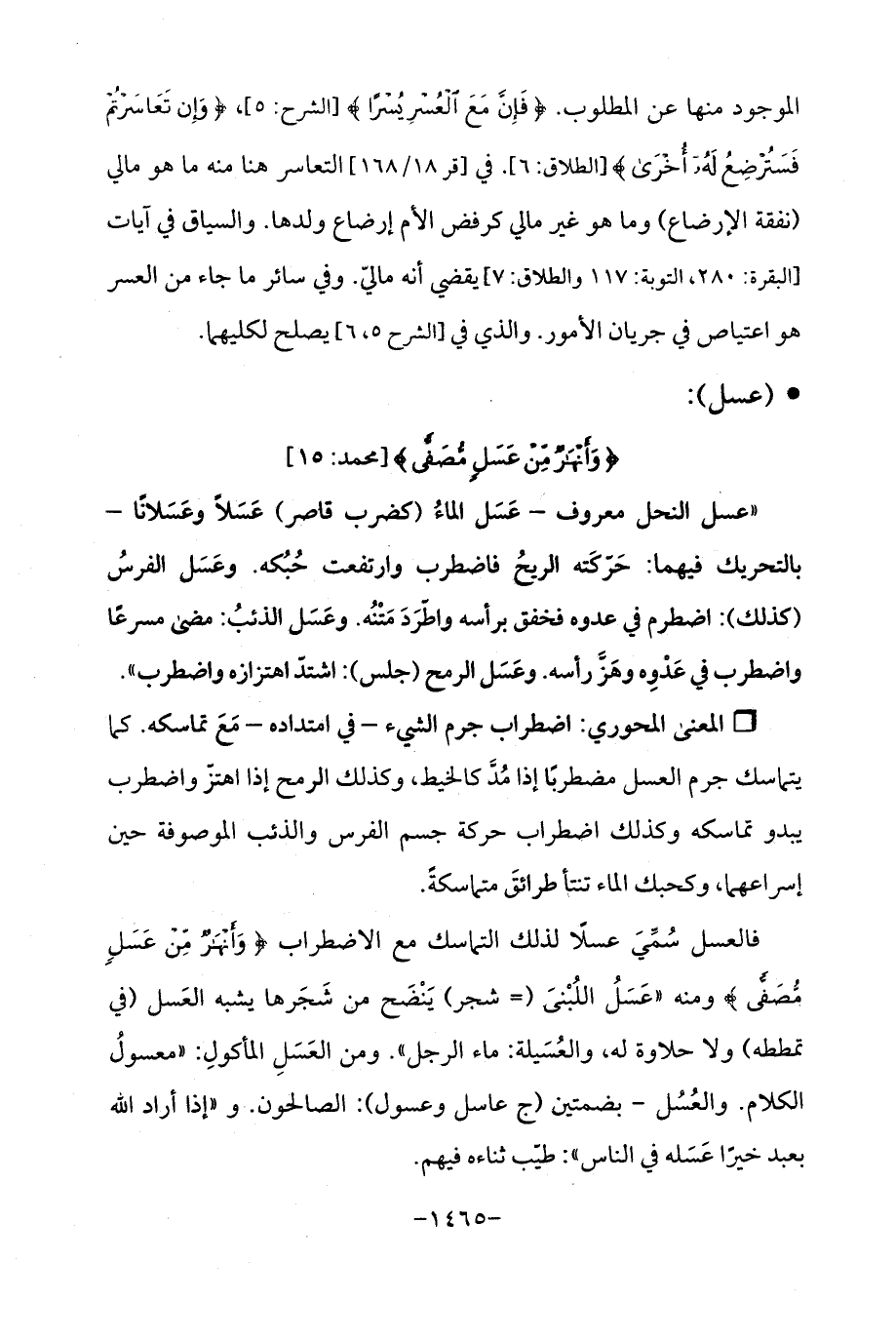 الموجود منها عن المطلوب. {فَإِنَّ مَعَ الْعُسْرِ يُسْرًا} [الشرح: 5]، {وَإِنْ تَعَاسَرْتُمْ فَسَتُرْضِعُ لَهُ أُخْرَى} [الطلاق: 6]. في [قر 18/ 168] التعاسر هنا منه ما هو مالي (نفقة الإرضاع) وما هو غير مالي كرفض الأم إرضاع ولدها. والسياق في آيات [البقرة: 280، التوبة: 117 والطلاق: 7] يقضي أنه ماليّ. وفي سائر ما جاء من العسر هو اعتياص في جريان الأمور. والذي في [الشرح 5، 6] يصلح لكليهما.