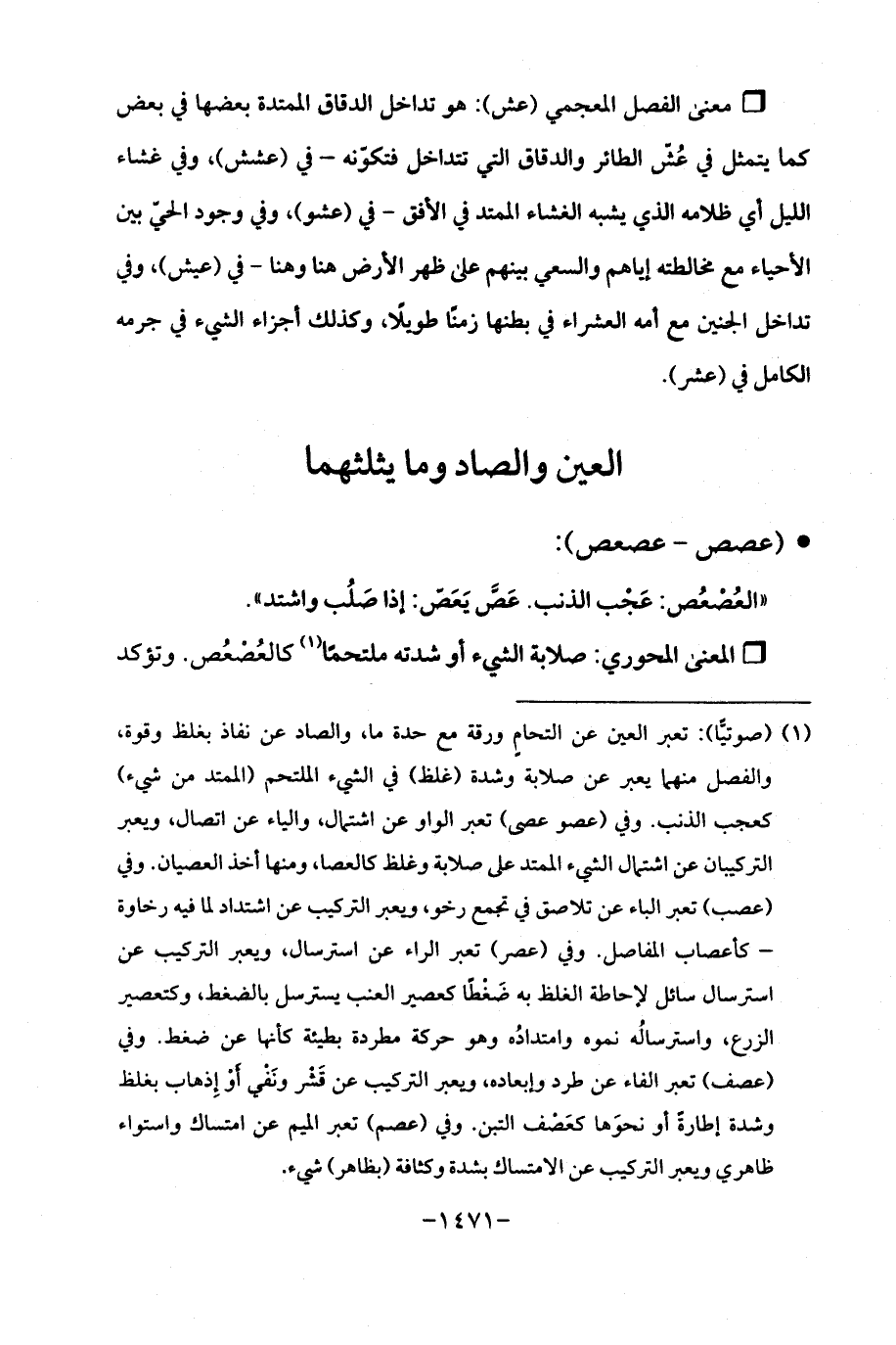 (¬1) (صوتيًّا): تعبر العين عن التحامٍ ورقة مع حدة ما، والصاد عن نفاذ بغلظ وقوة، والفصل منهما يعبر عن صلابة وشدة (غلظ) في الشيء الملتحم (الممتد من شيء) كعجب الذنب. وفي (عصو عصى) تعبر الواو عن اشتمال، والياء عن اتصال، ويعبر التركيبان عن اشتمال الشيء الممتد على صلابة وغلظ كالعصا، ومنها أخذ العصيان. وفي (عصب) تعبر الباء عن تلاصق في تجمع رخو، ويعبر التركيب عن اشتداد لما فيه رخاوة -كأعصاب المفاصل. وفي (عصر) تعبر الراء عن استرسال، ويعبر التركيب عن استرسال سائل لإحاطة الغلظ به ضَغْطًا كعصير العنب يسترسل بالضغط، وكتعصير الزرع، واسترسالُه نموه وامتدادُه وهو حركة مطردة بطيئة كأنها عن ضغط. وفي (عصف) تعبر الفاء عن طرد وإبعاده، ويعبر التركيب عن قَشْر ونَفْي أَوْ إِذهاب بغلظ وشدة إطارةً أو نحوَها كعَصْف التبن. وفي (عصم) تعبر الميم عن امتساك واستواء ظاهري ويعبر التركيب عن الامتساك بشدة وكثافة (بظاهر) شيء.