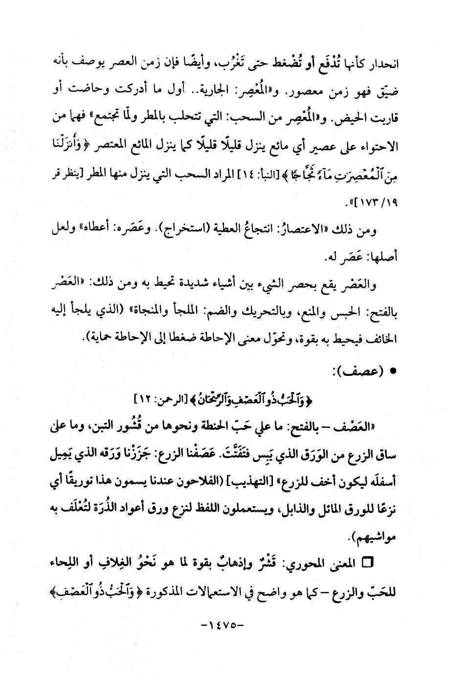 Qقَشْرٌ وإذهابٌ بقوة لما هو نَحْوُ الغِلافِ أو اللِحاء للحَبّ والزرع - كما هو واضح في الاستعمالات المذكورة {وَالْحَبُّ ذُو الْعَصْفِ}